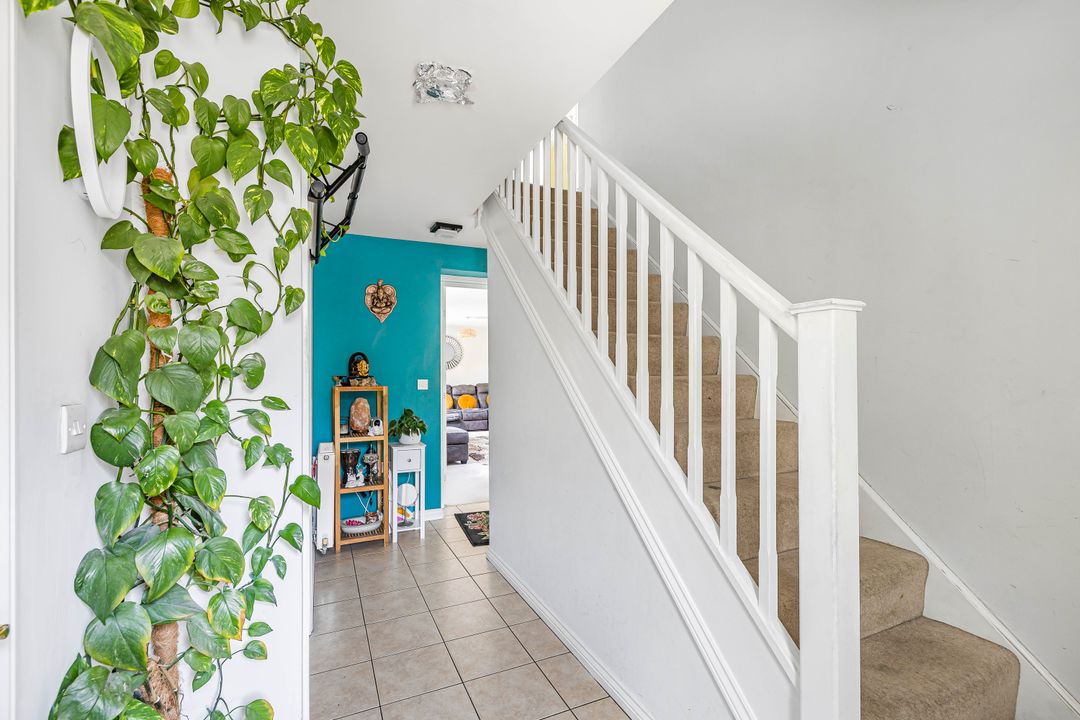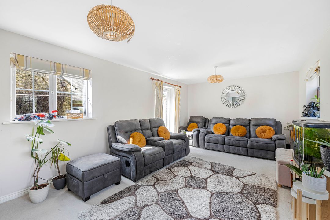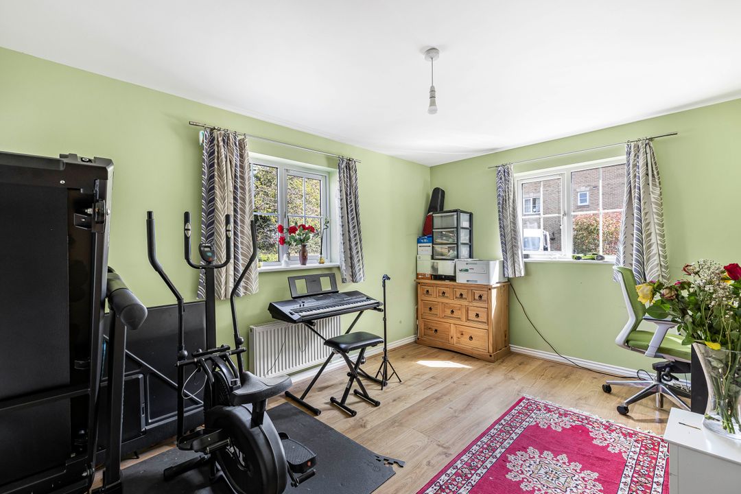 The house opens into a wide entrance hall with a cloakroom and storage cupboard beneath the stairs. Off the hall is a versatile reception room, ideal as a formal dining space or home office.