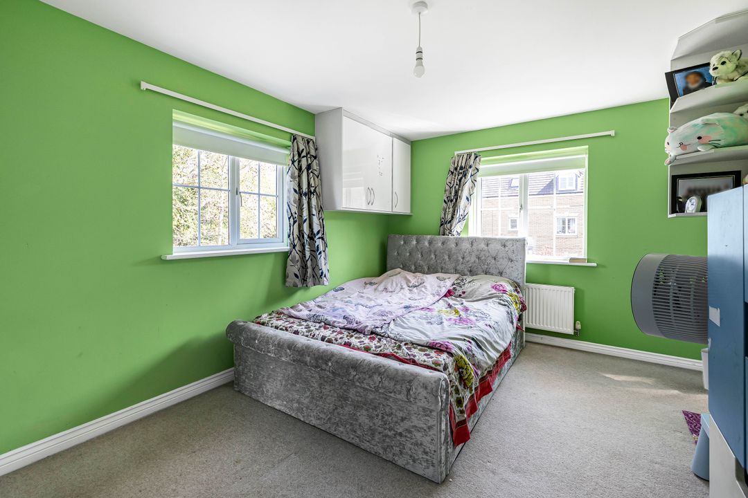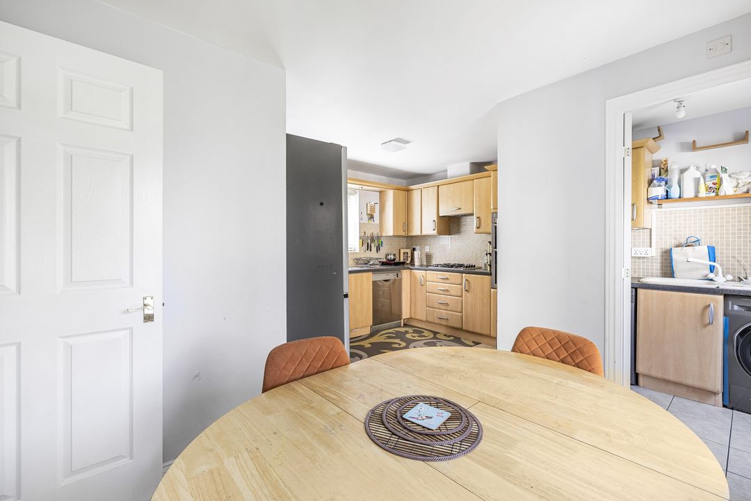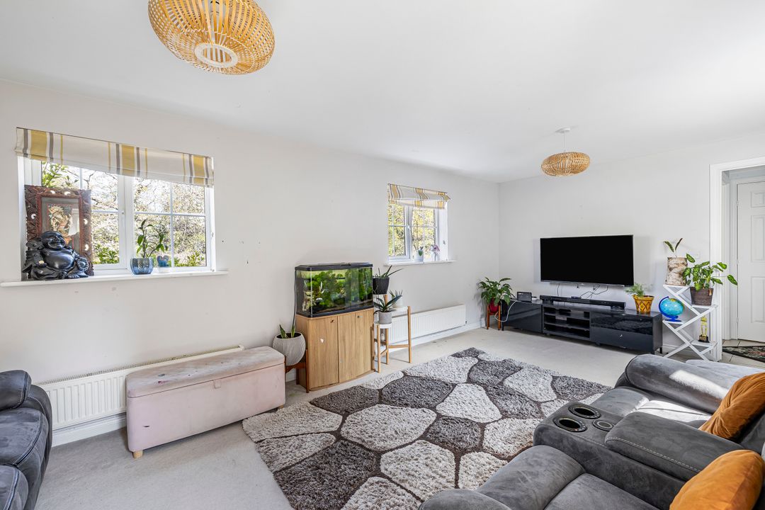 To the rear, a generous dual-aspect living room is filled with natural light and opens via French doors onto the garden. The adjacent kitchen/dining room also enjoys a dual aspect and garden access. It’s fitted with a range of modern units and integrated appliances, with plenty of space for a dining table. A separate utility room provides further storage and laundry space.