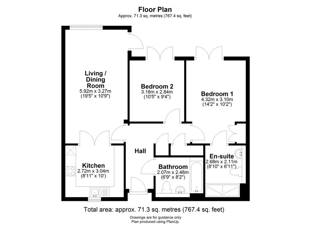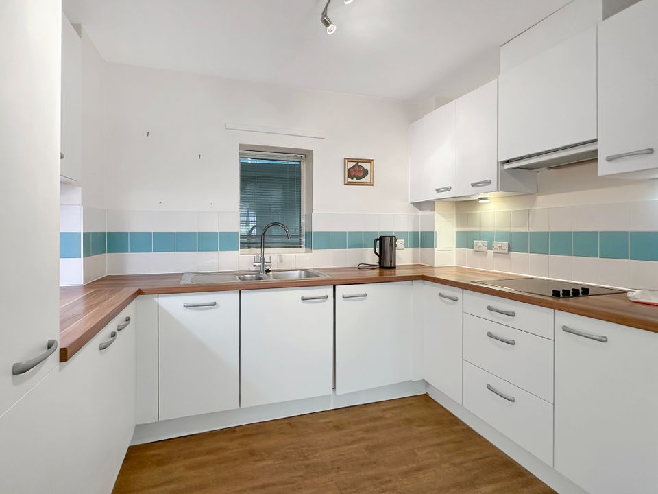 Apartment 46 is located on the ground floor and is approached over a wide communal hallway, with the front door opening to a spacious hallway with space for hanging coats and storing shoes. There is a built in airing and storage cupboard, and a bathroom fitted with a bath, w.c. and handbasin. The sitting room/dining room is a spacious, dual aspect room with a door leading out to a small terrace and the communal garden. The kitchen opens off the sitting room and is well fitted with a range of base and wall mounted units, set above and below ample working surfaces. There is a built in oven and an electric hob with extractor over, and an integrated fridge/freezer, washing machine, and dishwasher.