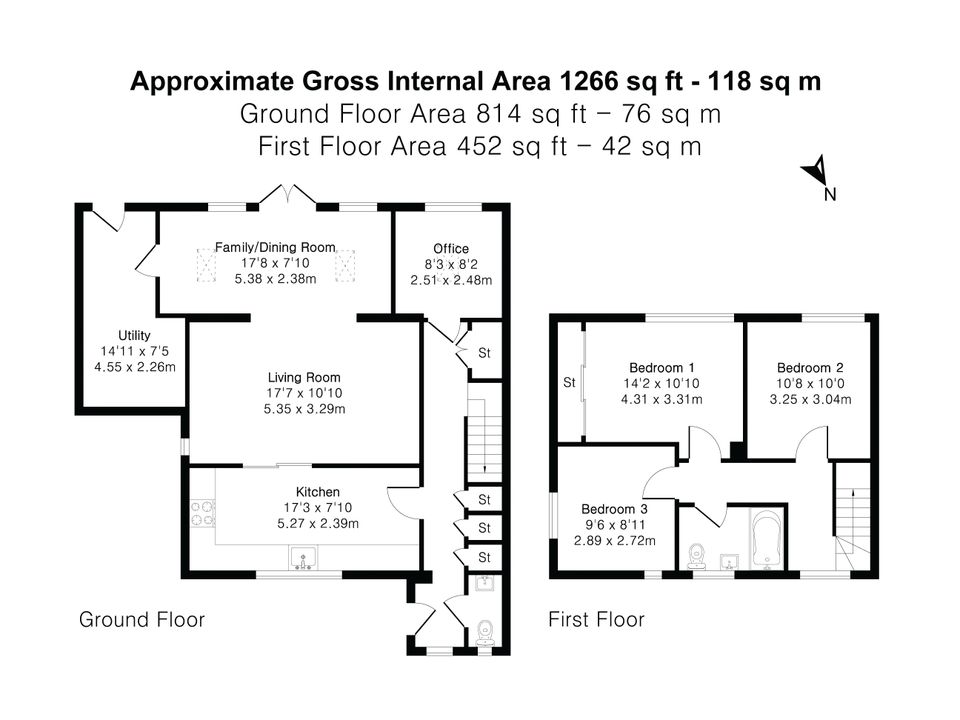 Upstairs, the first floor comprises three well-proportioned bedrooms. The principal bedroom and second bedroom are both generously sized doubles, while the third bedroom offers comfortable single/smaller double, or an ideal study. A modern family bathroom serves all rooms.