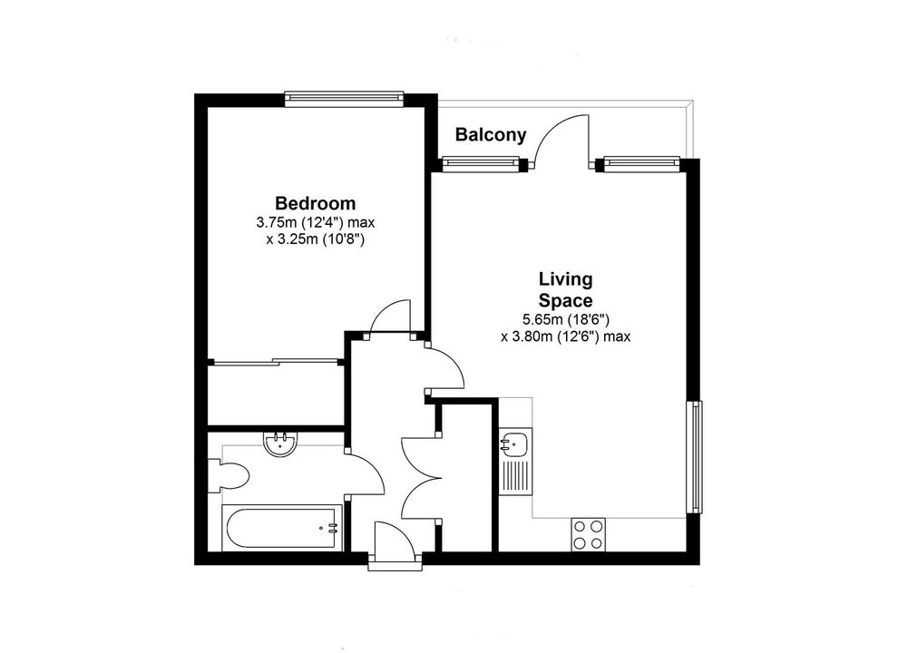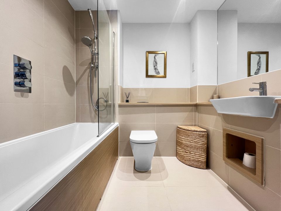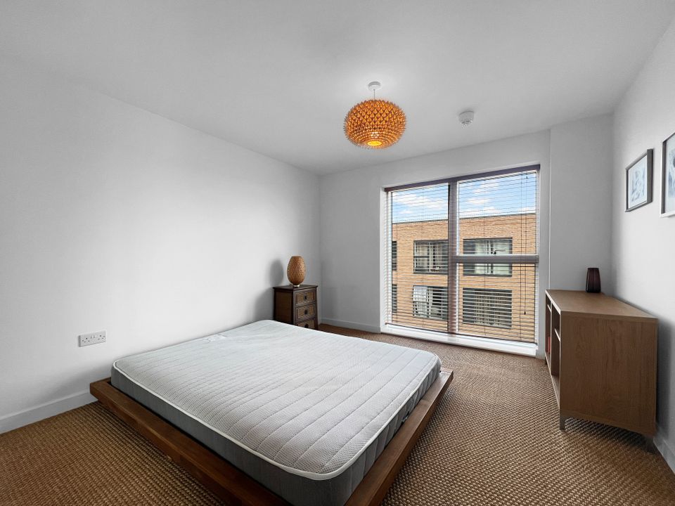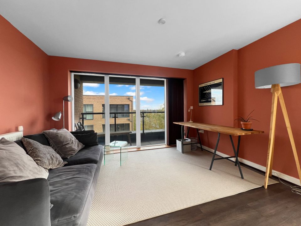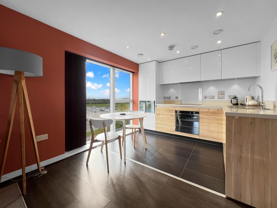The open-plan living/dining space is bright and spacious, with a high-quality fitted kitchen featuring composite stone worktops and integrated Smeg appliances. The bathroom is generously sized and stylishly finished, offering a full-sized bath with an independent shower over. The double bedroom includes a large fitted wardrobe.