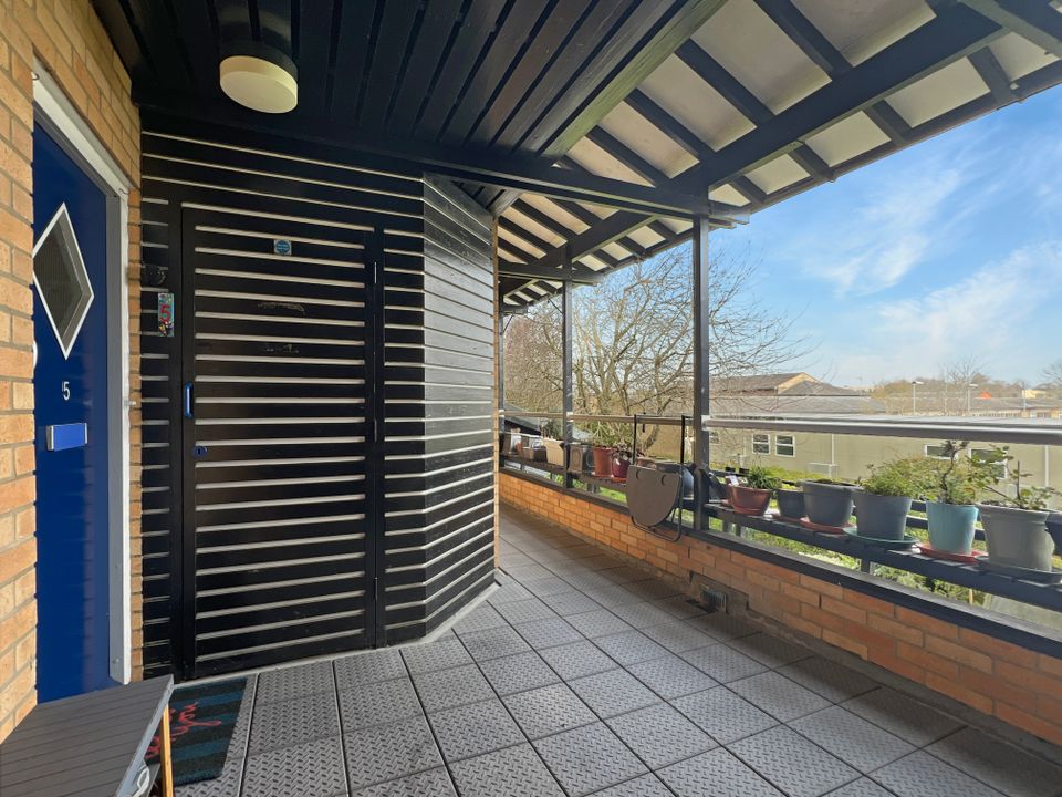 Positioned in one of the best spots within the development, this first-floor apartment enjoys a pleasant outlook over the communal gardens at the front and acres of gardens of the Cambridge Professional Development Centre at the rear. Inside, it features a bright sitting room that opens onto a west-facing balcony, a stylishly refitted kitchen / breakfast room, a beautifully decorated double bedroom, and a modern, refitted bathroom. The property also offers excellent storage, including a generous cupboard on the communal landing balcony. Gas-fired central heating and double-glazed windows contribute to its energy efficiency, its current EPC is C.