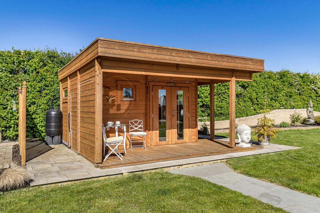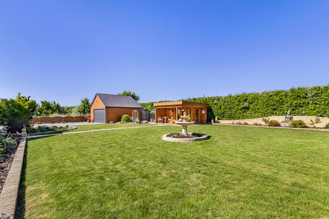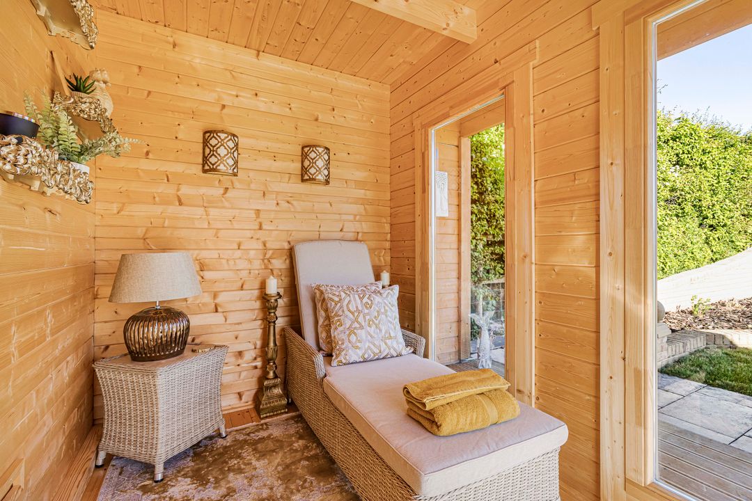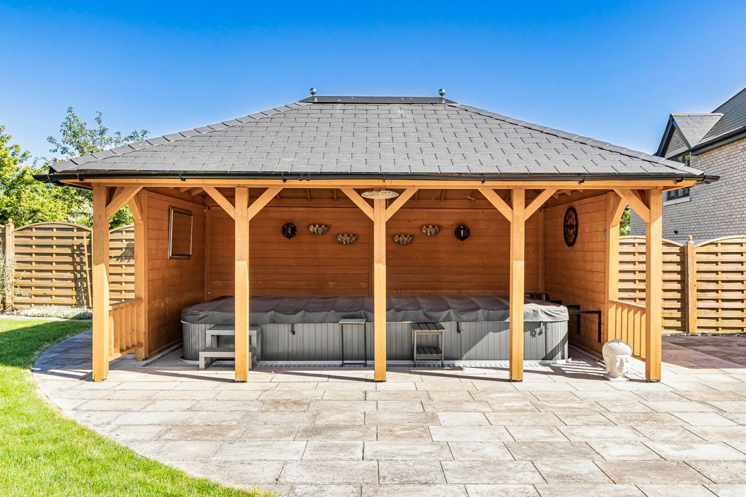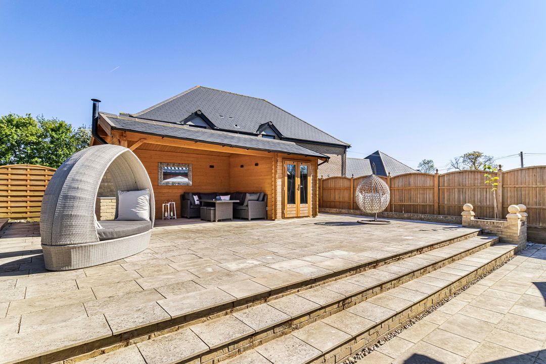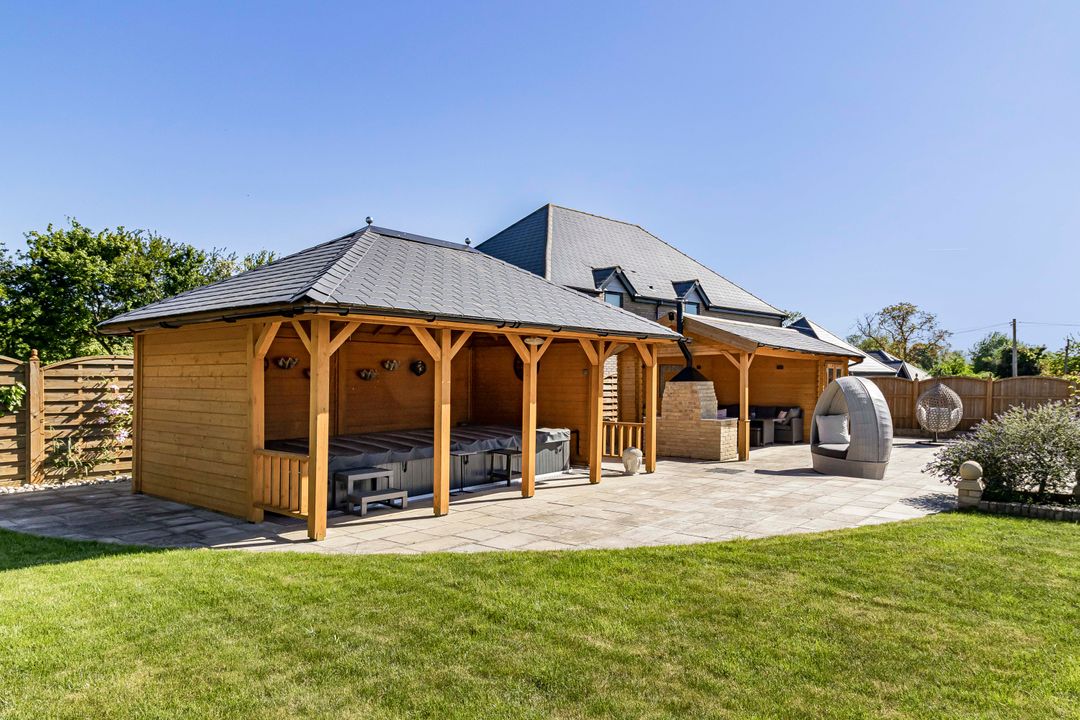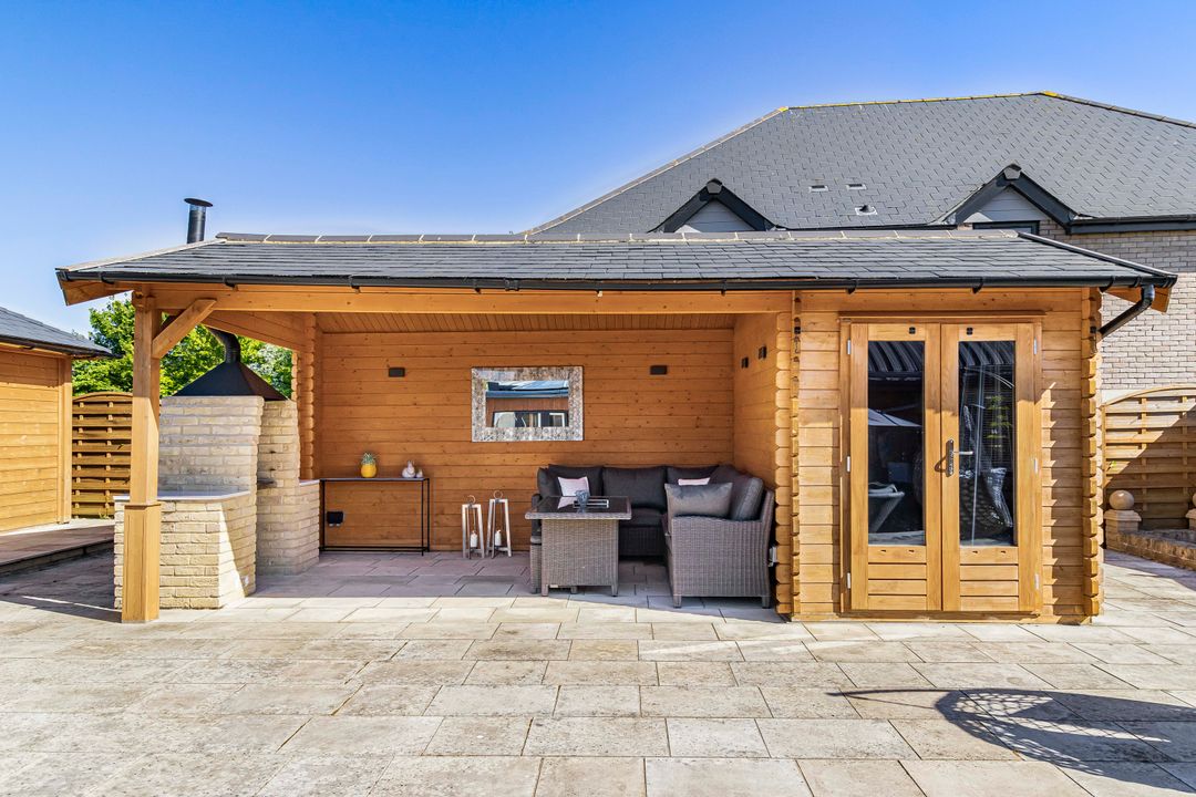 The exterior of the home is equally impressive, with multiple patio areas ideal for socialising and outdoor living. The garden features a collection of high-quality timber outbuildings, including a garden room, outdoor kitchen/BBQ area, pool room, spa room, and sauna, each constructed to an excellent standard with slate roofs, glazing, insulation, and full power and lighting. The large lawn is surrounded by mature planting and timber fencing, offering excellent privacy.