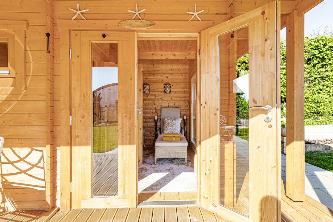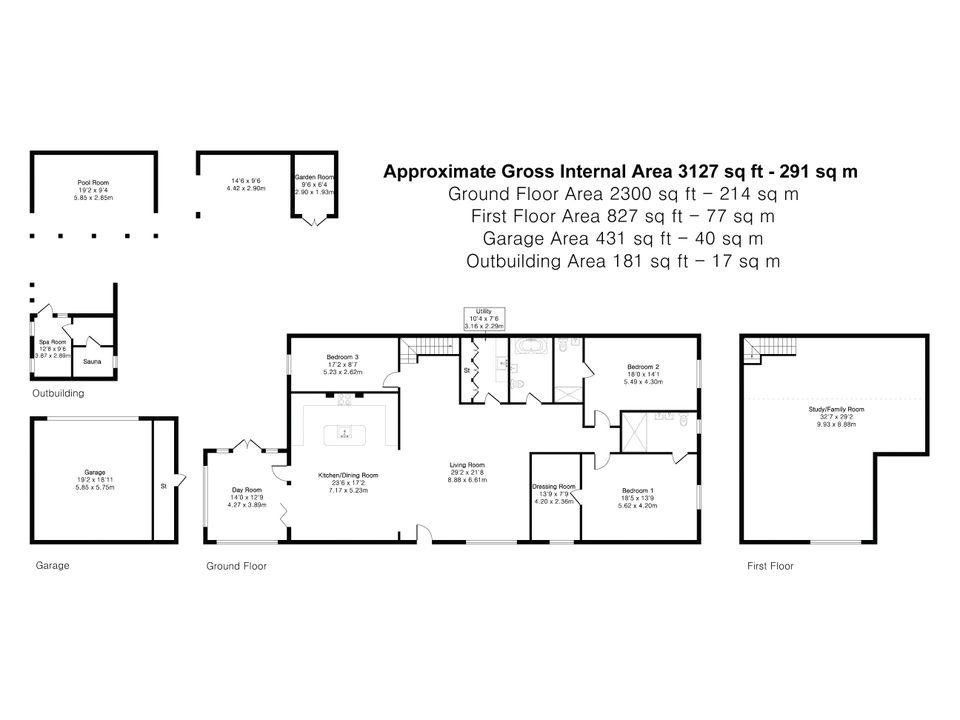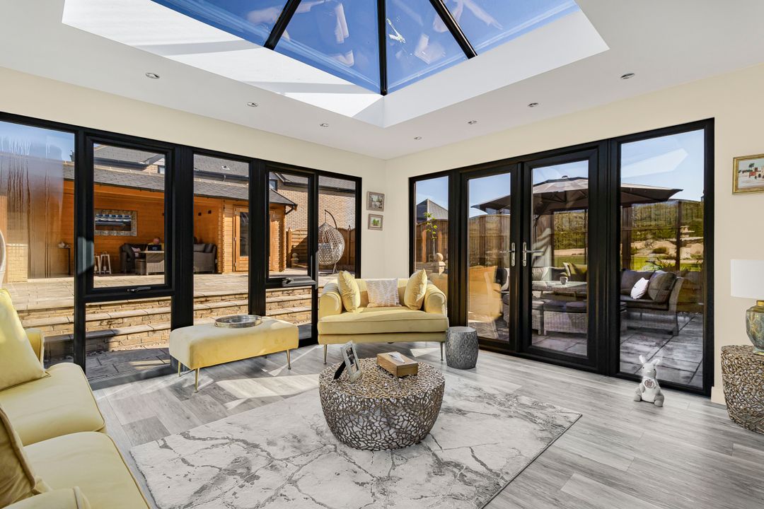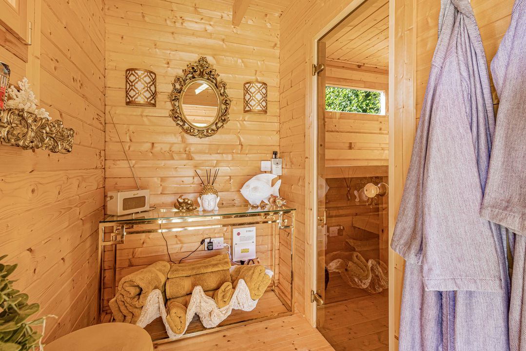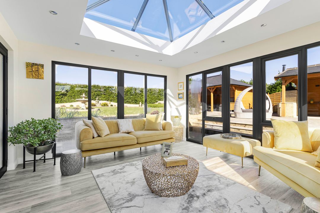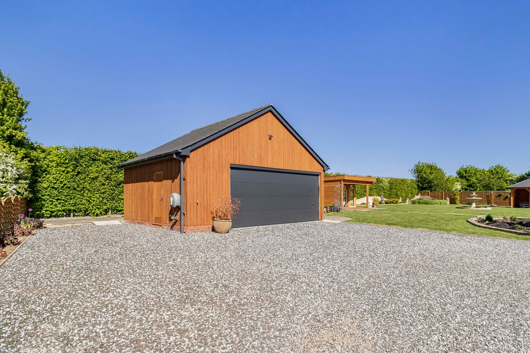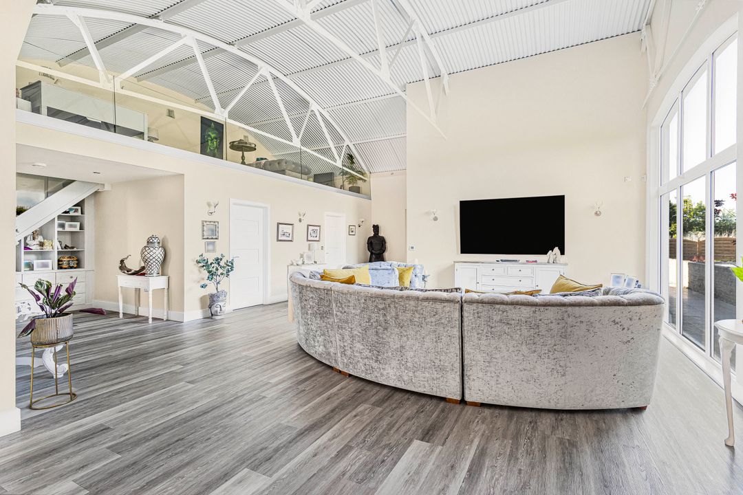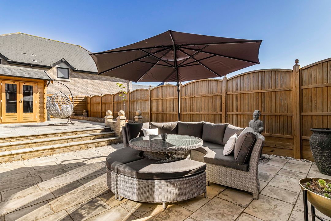 The exterior of the home is equally impressive, with multiple patio areas ideal for socialising and outdoor living. The garden features a collection of high-quality timber outbuildings, including a garden room, outdoor kitchen/BBQ area, pool room, spa room, and sauna, each constructed to an excellent standard with slate roofs, glazing, insulation, and full power and lighting. The large lawn is surrounded by mature planting and timber fencing, offering excellent privacy.