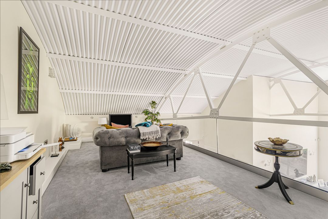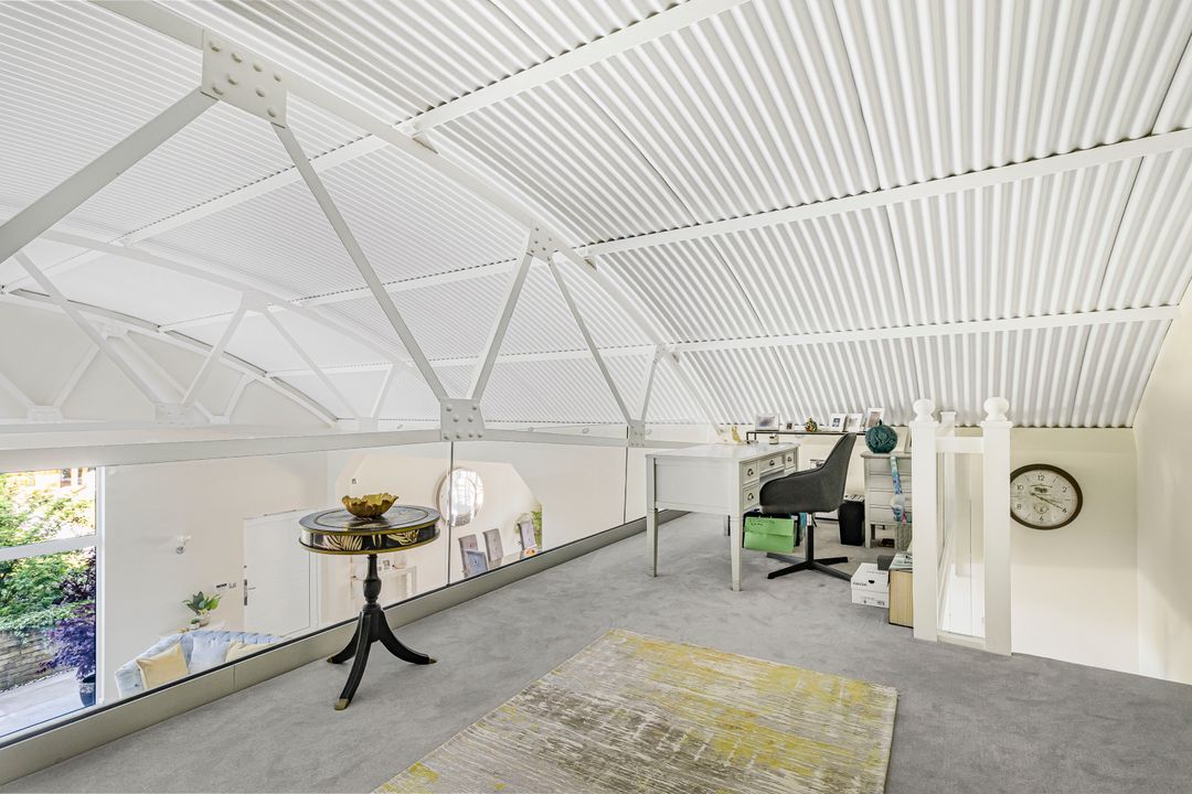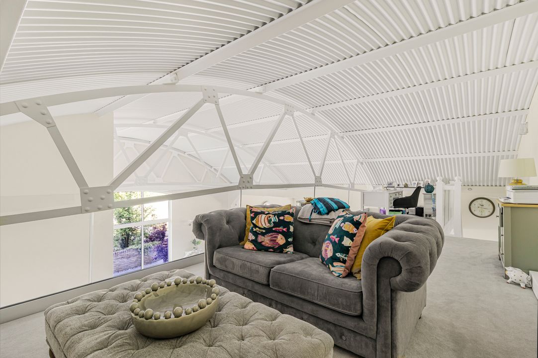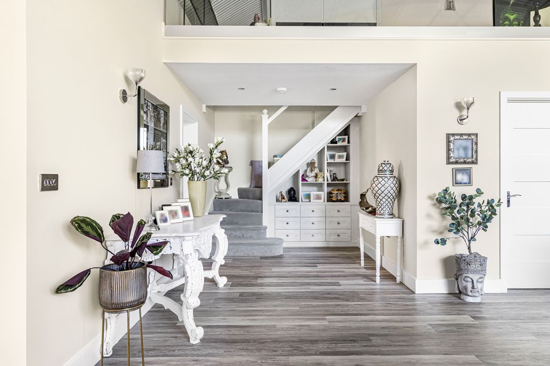 The heart of the property is an impressive open-plan living, dining, and kitchen area, showcasing a vaulted ceiling with exposed steel joists and roofline. A striking design feature, the mezzanine level with glass balustrade overlooks the main living space, enhancing the sense of light and volume. Bespoke storage and shelving line the stairway to the upper floor, blending practicality with stylish design.