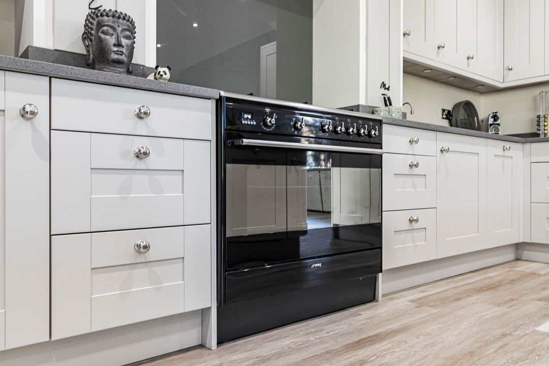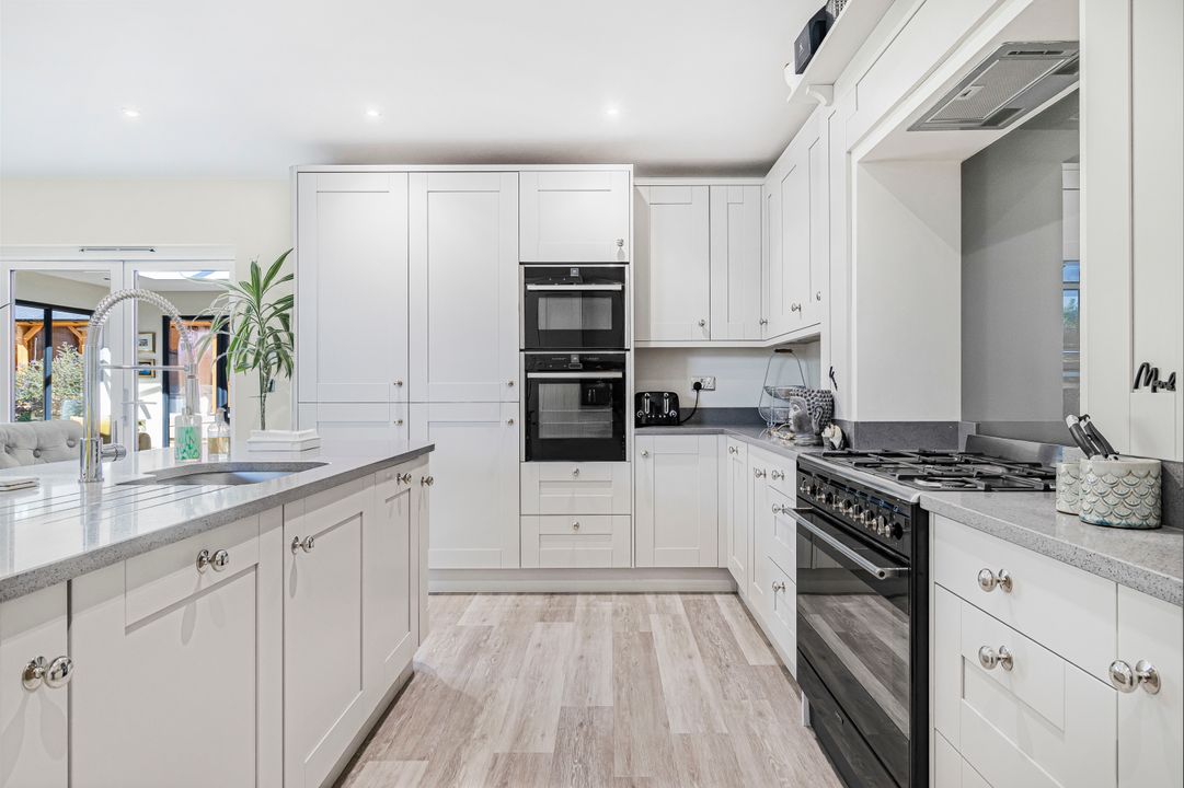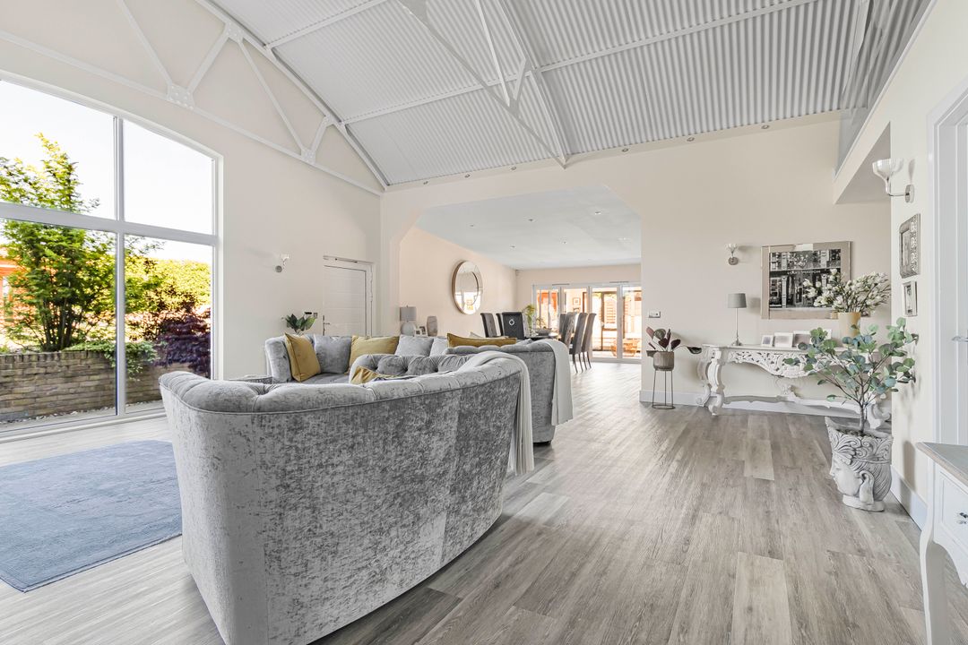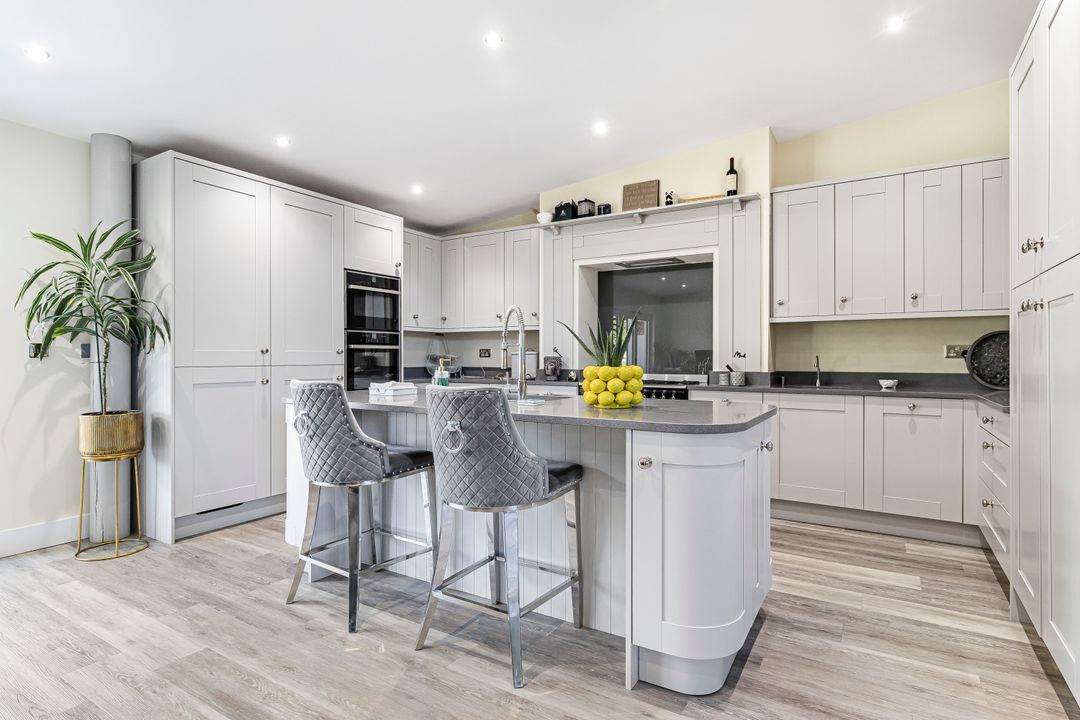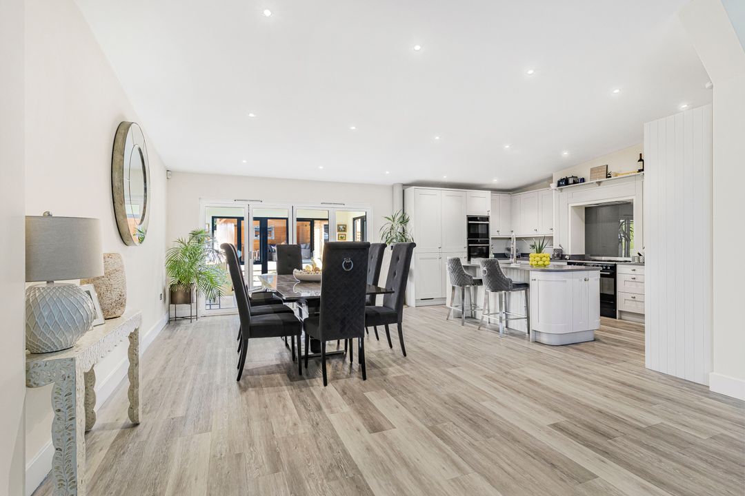 Flooded with natural light, the main living space is perfect for entertaining, with bi-folding doors leading to a bright day room. From here, French doors open to the patio and gardens beyond. The kitchen is finished to the highest standard with a comprehensive range of wall and base units, generous granite work surfaces, an island with breakfast bar, and fully integrated appliances.