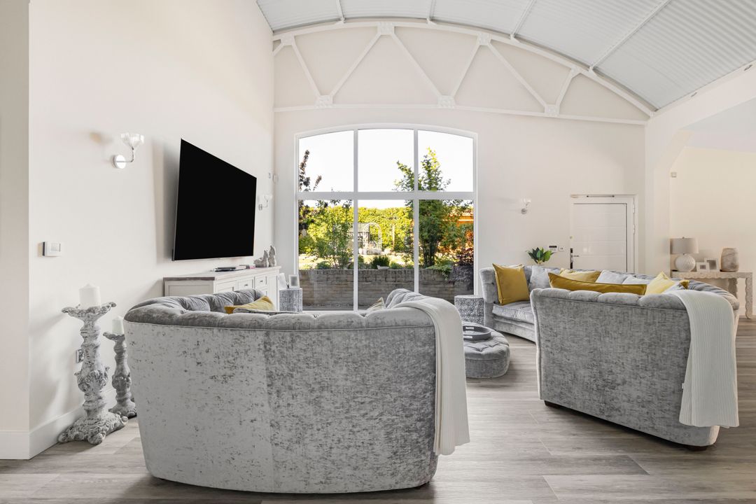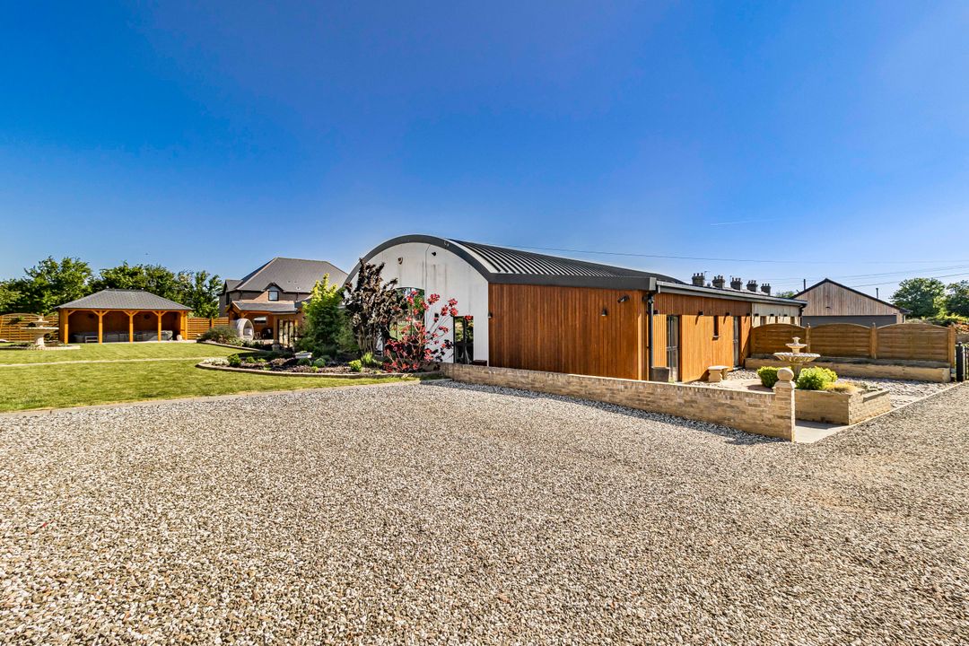 This outstanding individual residence is accessed via a gravel driveway, flanked by sleek metal railings and gates that open to an expansive parking area and detached double garage. The beautifully landscaped gardens create a striking first impression and set the tone for the high specification found throughout the home.