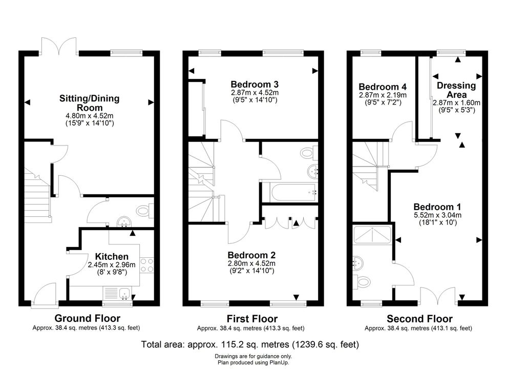 On the second floor, the master bedroom provides a peaceful retreat with its generous proportions at 5.52m x 3.04m (18'1" x 10'), along with a private en suite bathroom. This floor also includes Bedroom 4, measuring 2.87m x 2.19m (9'5" x 7'2"), and a dressing area of 2.87m x 1.60m (9'5" x 5'3"), offering flexible use for storage or a home office setup.