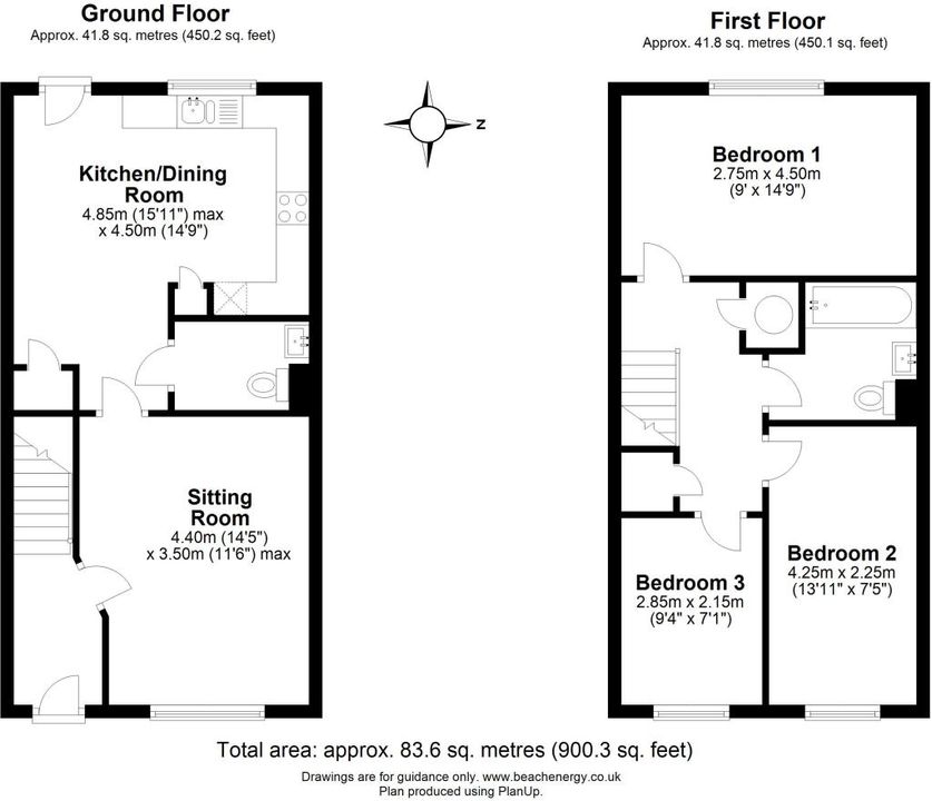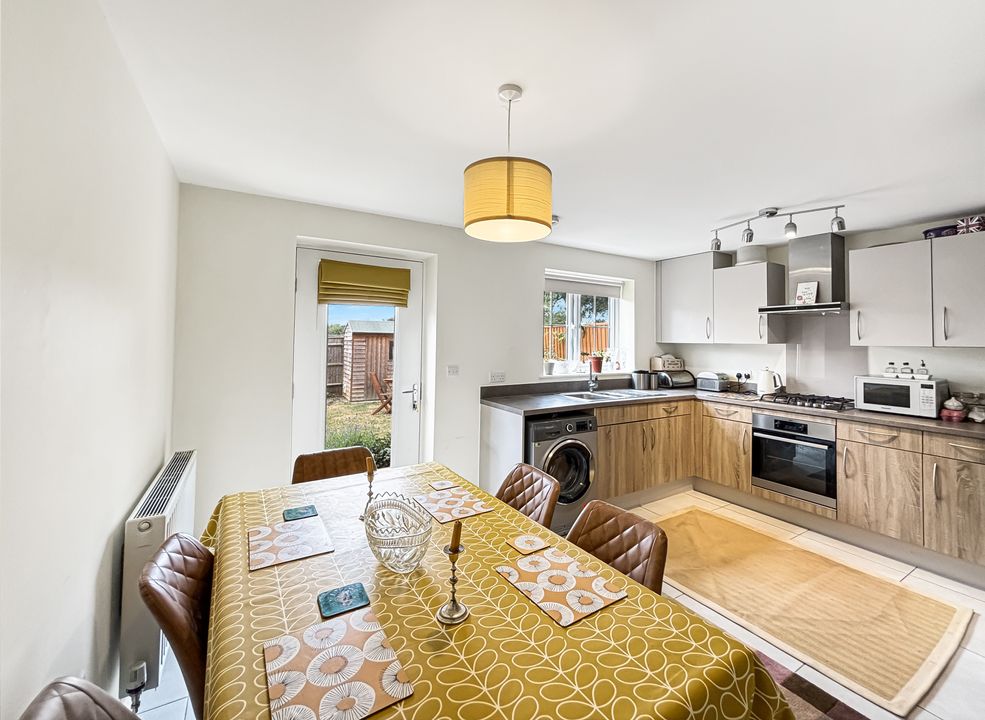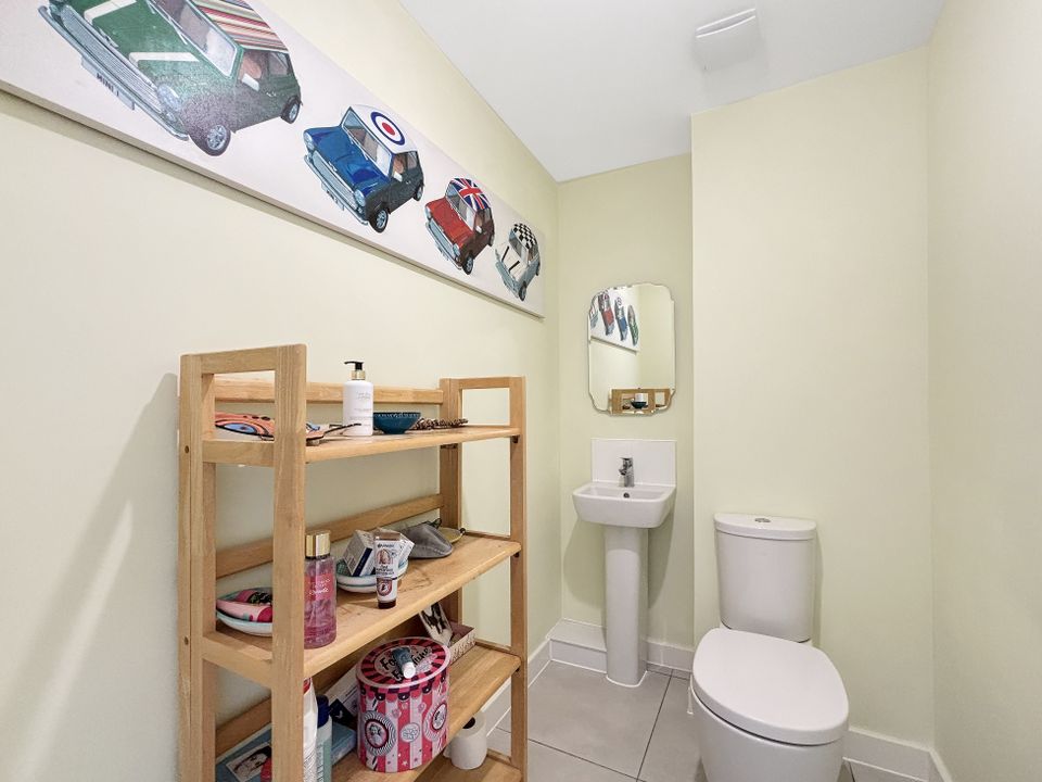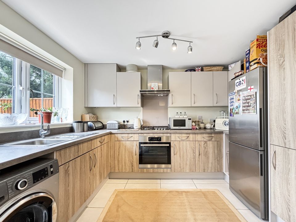 On the ground floor, you are welcomed into an entrance hall that leads to a generous sitting room, offering a bright and comfortable space for relaxation. To the rear, the large kitchen/dining room spans the full width of the property, featuring ample workspace and cabinetry, with space for a dining table and access to the rear garden. A convenient downstairs cloakroom/WC completes the ground floor.