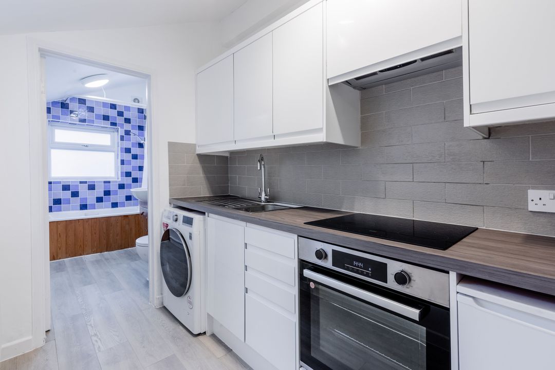 Beyond the dining room is a modern fitted kitchen, finished with a range of wall and base units with worktops and tiled splashbacks, together with an integrated oven and hob and space for further appliances. The kitchen leads through to the bathroom which is located at the rear of the property and fitted with a bath and shower over, WC and wash hand basin, with a window providing natural light.