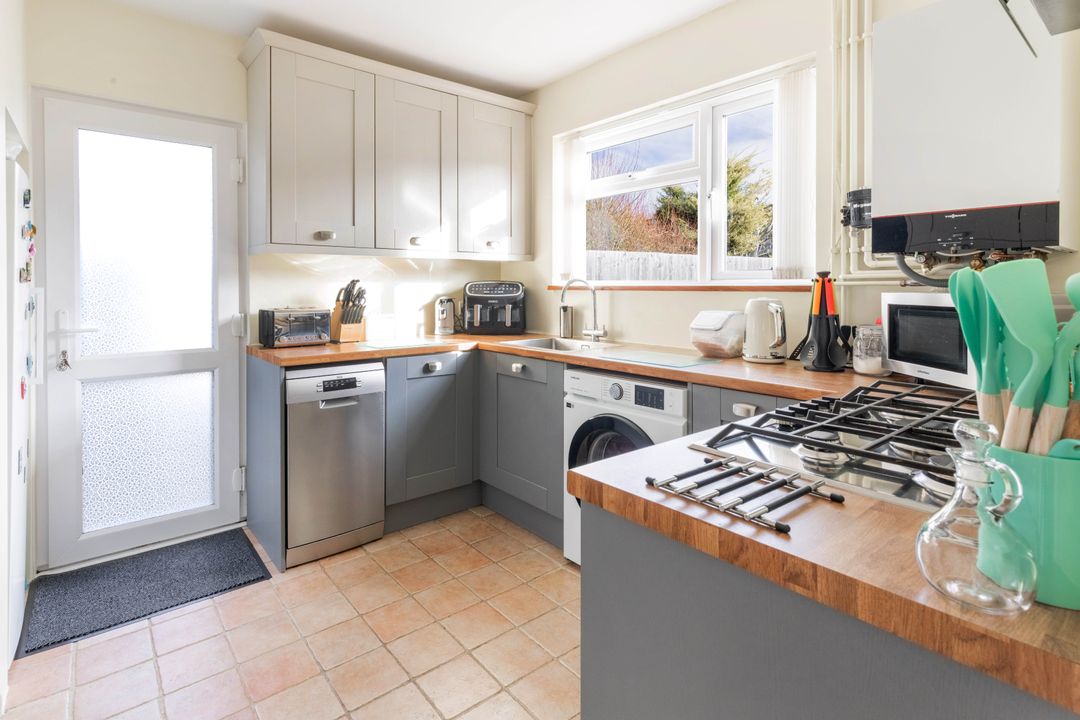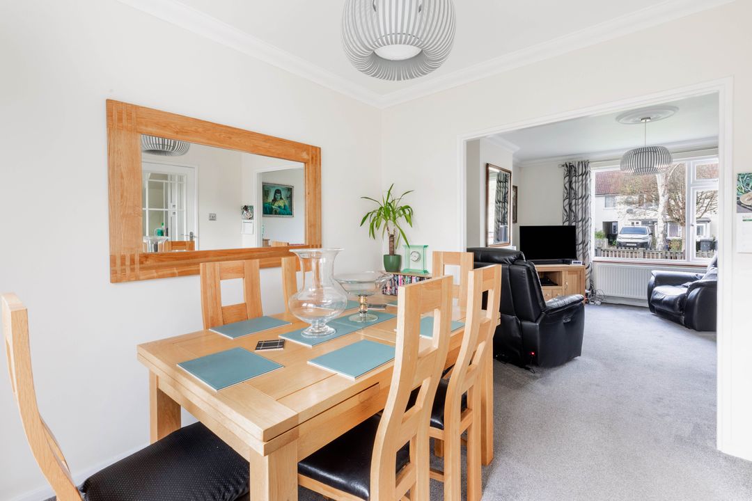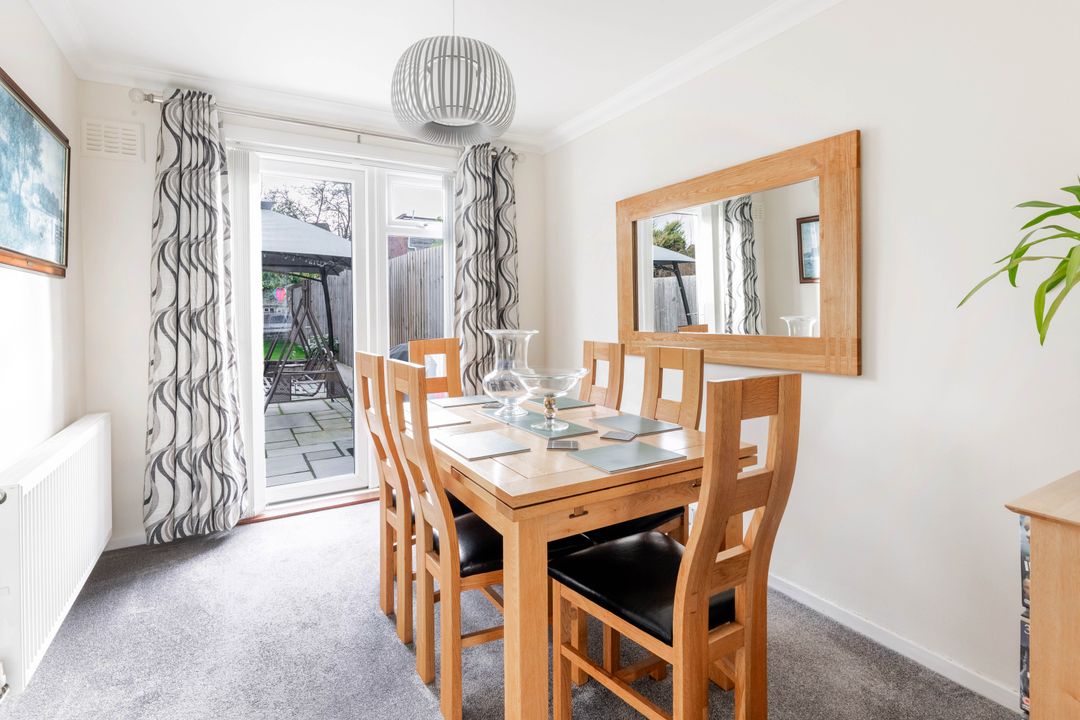 The ground floor features a welcoming entrance area leading into a spacious sitting room with a large front-facing window, creating a bright and inviting atmosphere. To the rear, the property offers a separate dining room with direct access to the garden, perfect for entertaining or family meals. The adjoining kitchen is fitted with a range of modern base and wall units, ample worktop space, and room for appliances, with a door leading out to the rear garden.