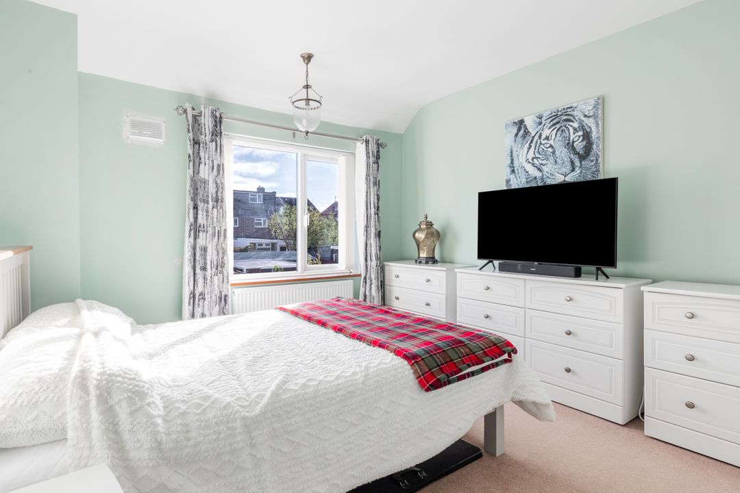 Upstairs, there are three bedrooms, including a generous main bedroom and two additional bedrooms suitable for children, guests, or use as a home office. The family bathroom is well appointed, fitted with a bath and overhead shower, WC, and wash basin.