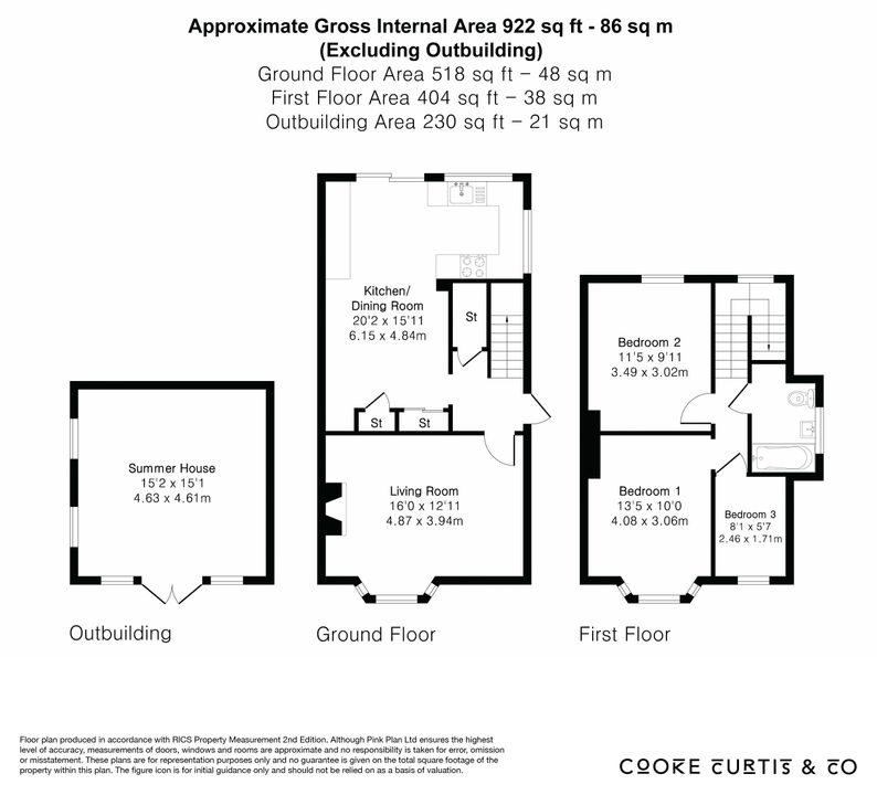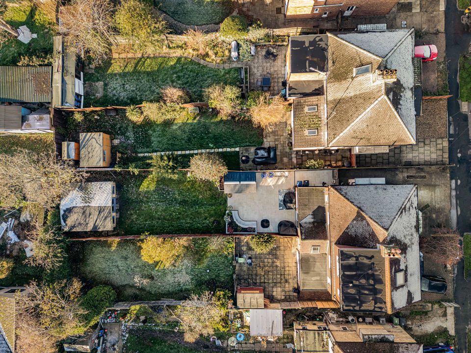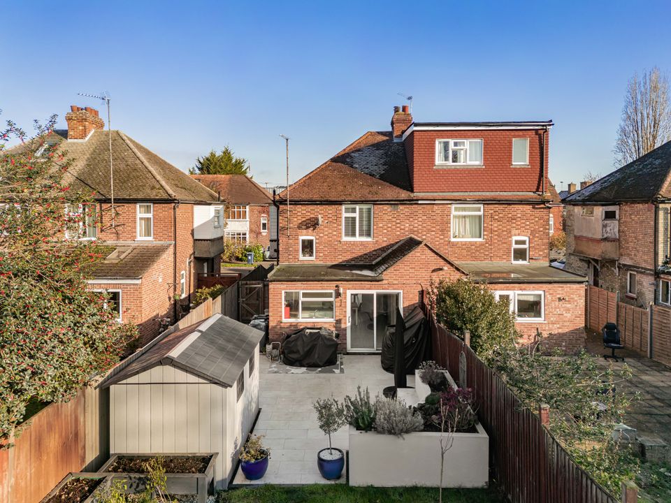 Outside, the property offers a driveway providing parking for up to three cars, along with secure gated side access leading to a garage that’s perfect for storage. The south-facing rear garden, extending to approximately 27 metres (88 feet), is beautifully maintained with a paved terrace, long lawn, and well-stocked flower beds. At the far end of the garden sits a versatile detached studio, ideal as a home office, gym, or creative workspace.