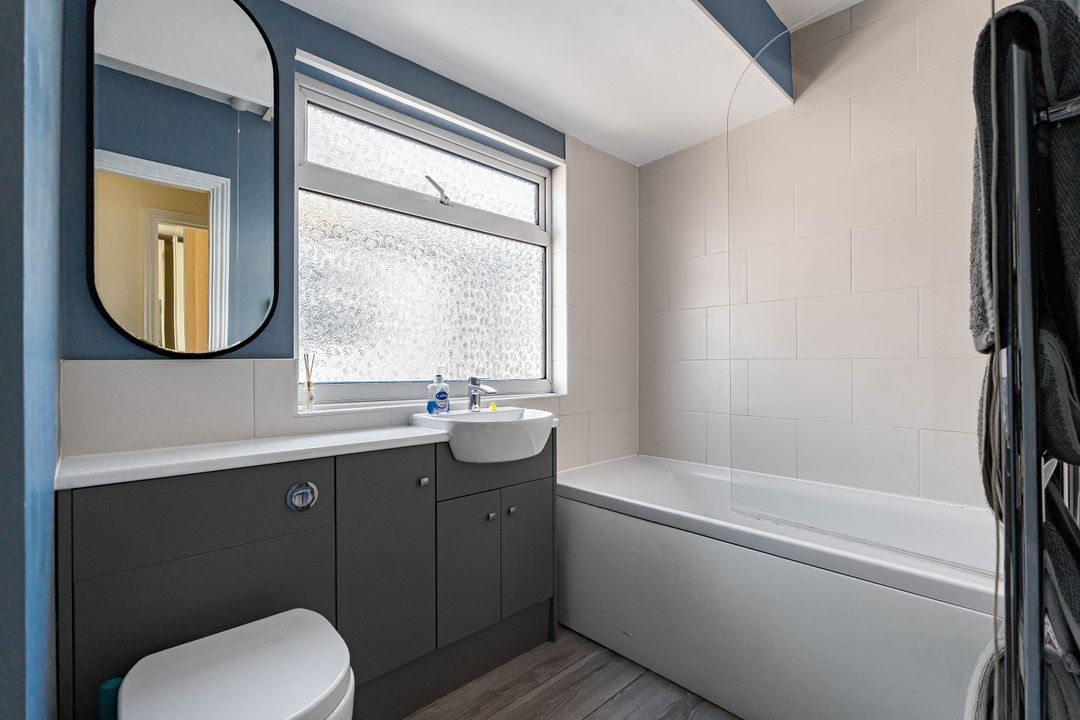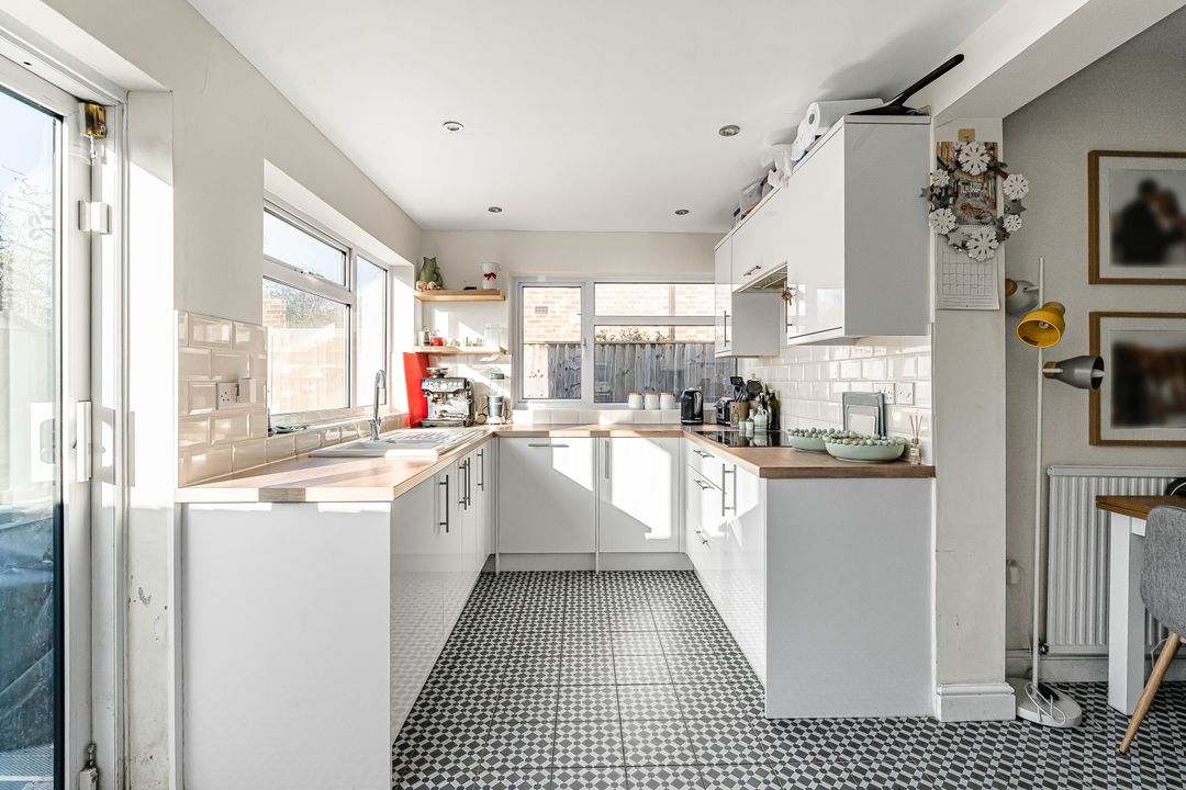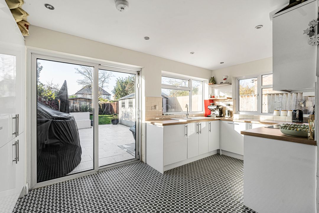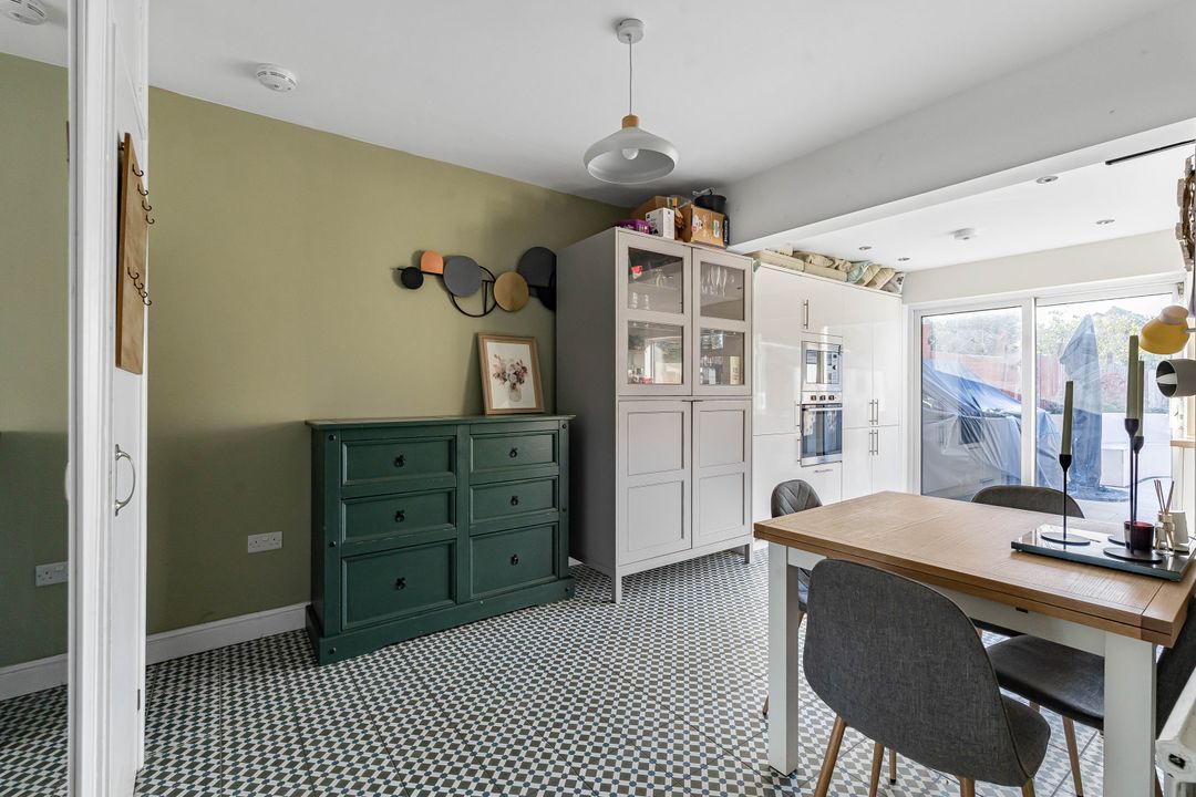 To the rear, the impressive open-plan kitchen/dining room enjoys a dual aspect and is fitted with a contemporary range of units and integrated appliances, including a dishwasher, fridge/freezer, oven, and induction hob. Stylish tiled flooring and ample built-in storage complement the space, while sliding doors open directly onto the south-facing rear garden, ideal for indoor-outdoor living.