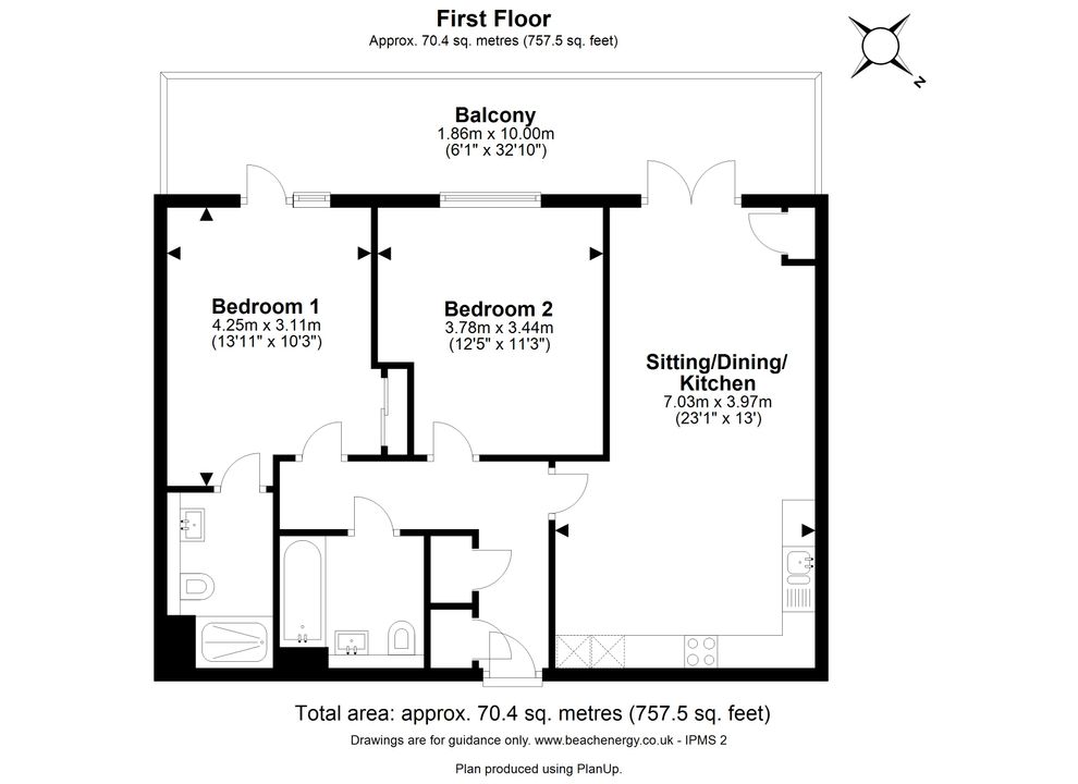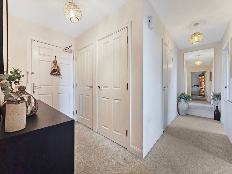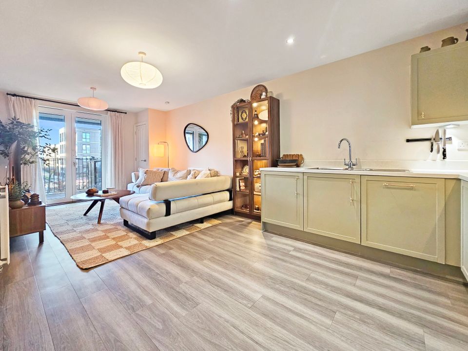 The open plan kitchen/living/dining room is filled with natural light via the French doors which open onto the large balcony which spans the full width of the apartment and benefits from far-reaching views over the meadows providing an ideal space for alfresco dining. The kitchen has been fitted with a range of stylish base and wall-mounted units, an integral fridge/freezer, a dishwasher, and an oven with a 4-ring gas hob with an extractor over.