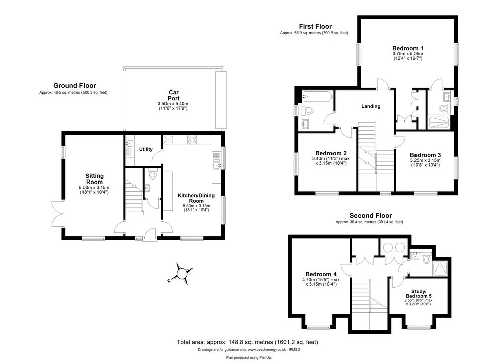 The second floor landing is fitted with a range of built-in cupboards and leads to two further bedrooms, comprising a generous double and a good-sized single currently used as a study. A shower room, again fitted with a modern white three-piece suite, completes the accommodation. The loft has been boarded to provide additional storage.