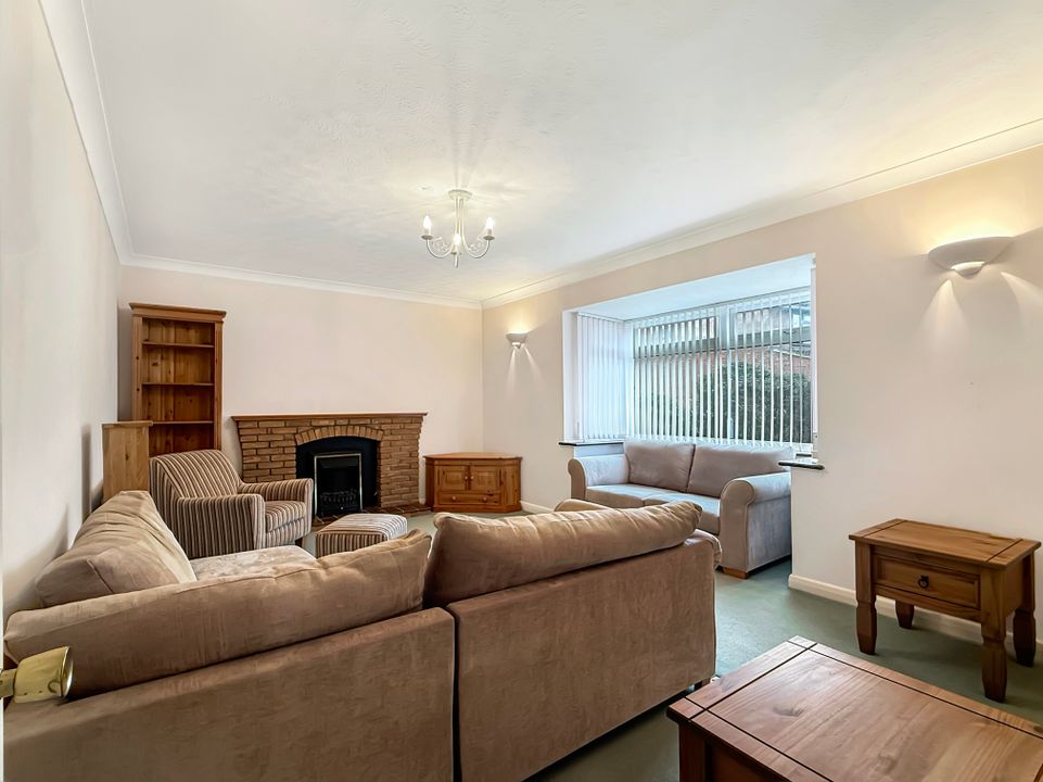 The sitting room is positioned to the front of the property and features a charming bay window that floods the space with natural light, along with a feature fireplace set within a brick surround.