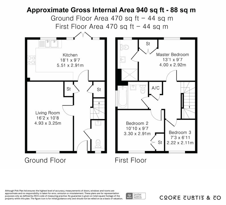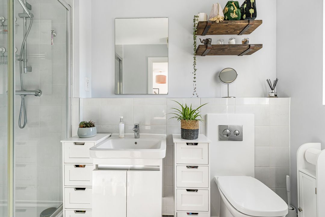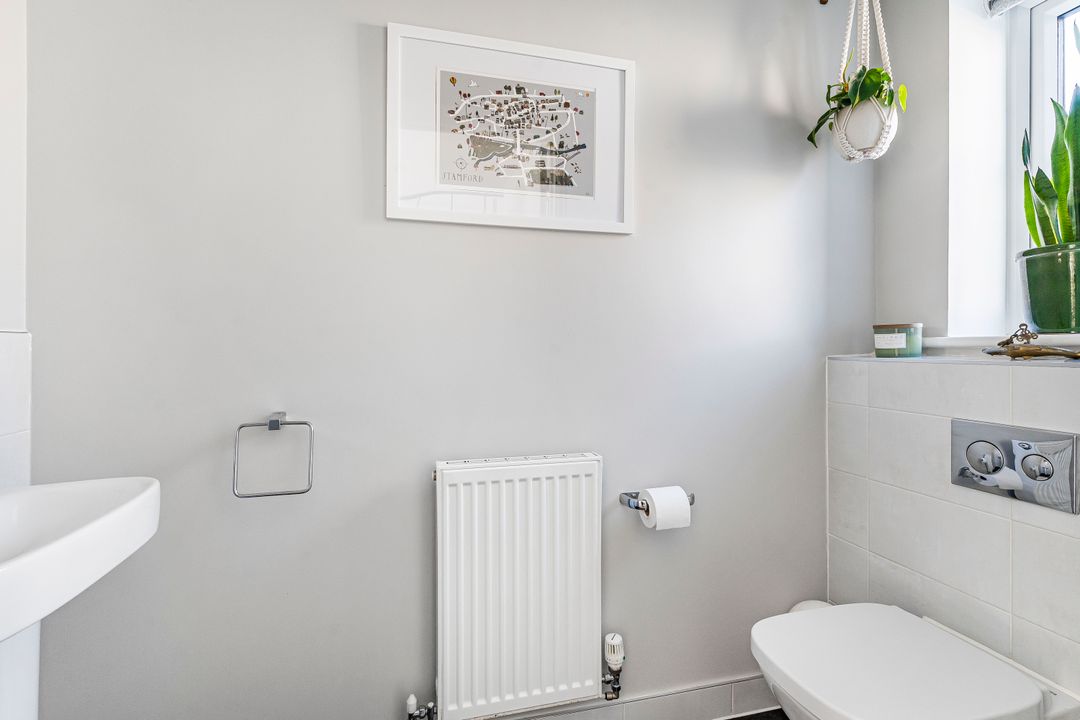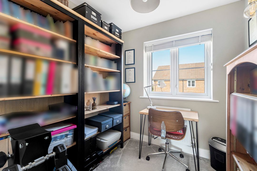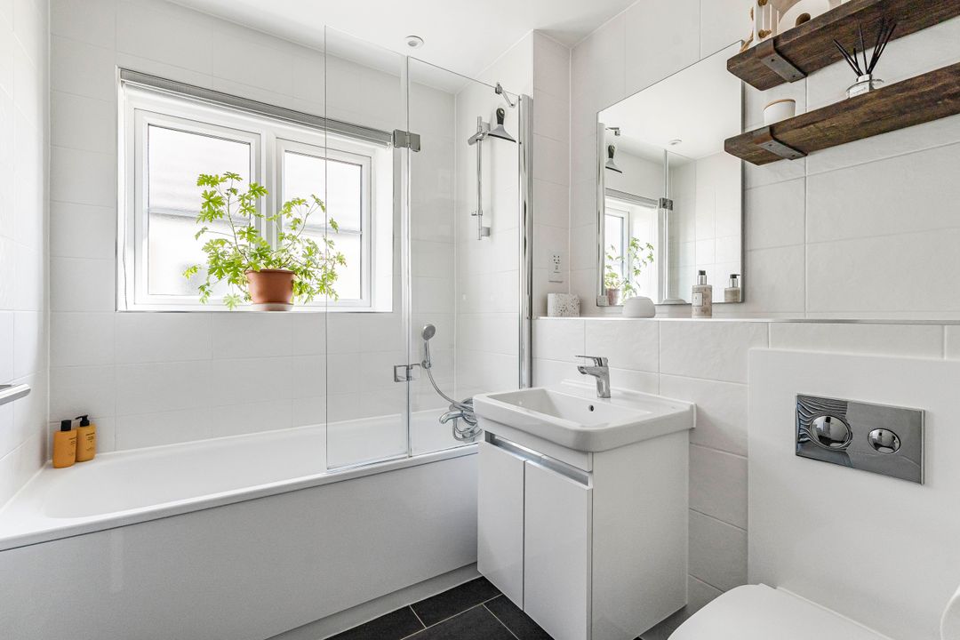 Upstairs, there are three bedrooms: two doubles and a single, which is currently being used as a home office. Both the first and second bedrooms benefit from built-in wardrobes, and the master bedroom also features an ensuite shower room. The family bathroom is fitted with a modern white suite, including a shower over the bath with a glass shower screen, and finished with attractive floor-to-ceiling tiles.