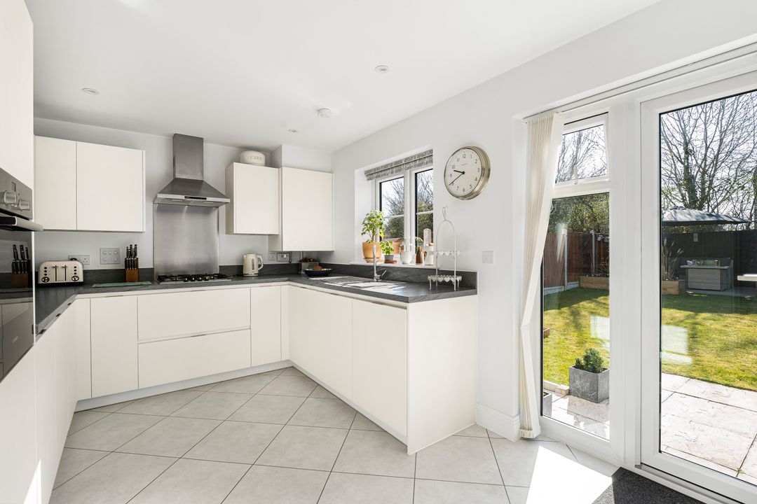 At the rear of the property, the kitchen/dining room overlooks the landscaped garden. French doors open directly onto the garden, offering a seamless transition between indoor and outdoor spaces. The kitchen is fitted with modern units, providing ample work surfaces and integrated appliances, including a fridge/freezer, dishwasher, gas hob with extractor over, and an inset sink that overlooks the rear garden. There is also space for a dining table at the far end of the room. A convenient W.C. completes the ground floor accommodation.