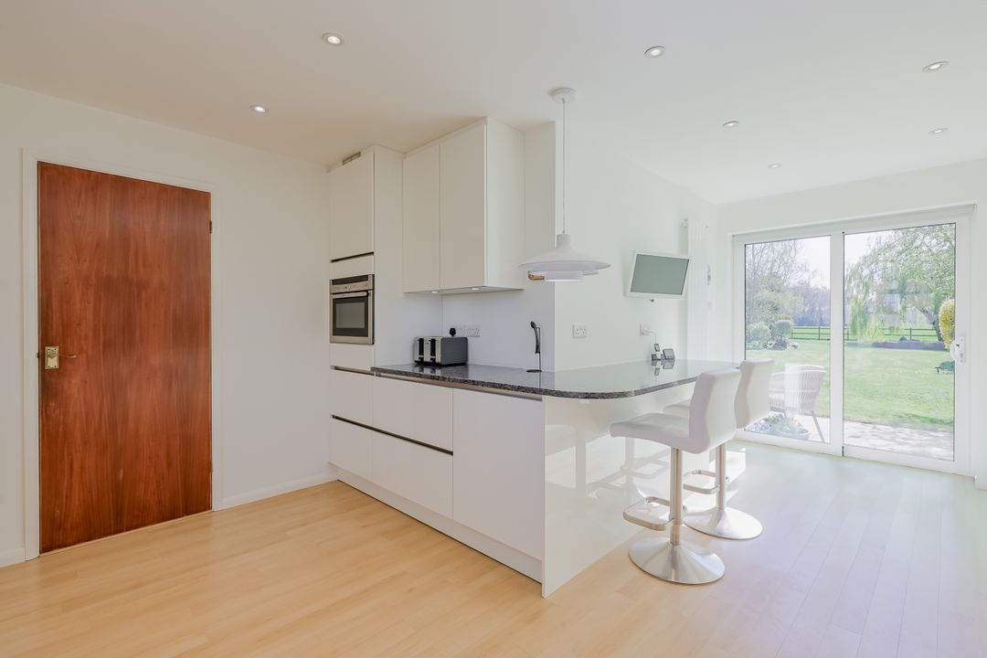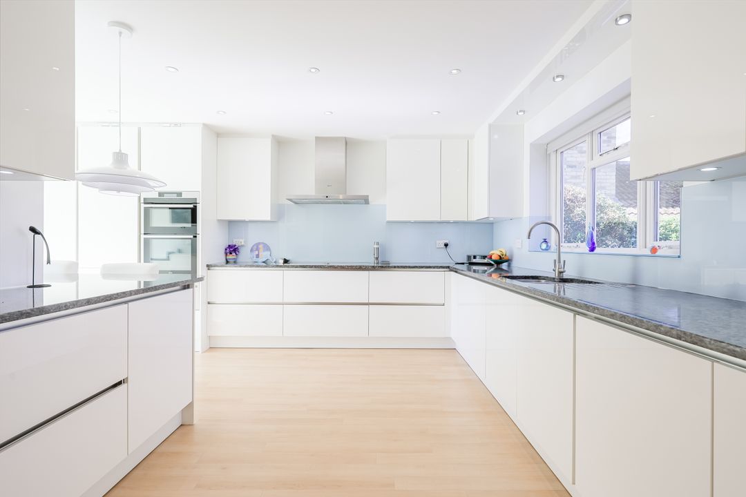 The kitchen has been tastefully refitted, providing an abundance of sleek base and eye-level units, extensive worktop space, and a breakfast bar. It comes well-equipped with two double ovens, a built-in microwave, an induction hob with an extractor fan, an integrated washing machine, and a dishwasher, and has direct access to the rear garden.