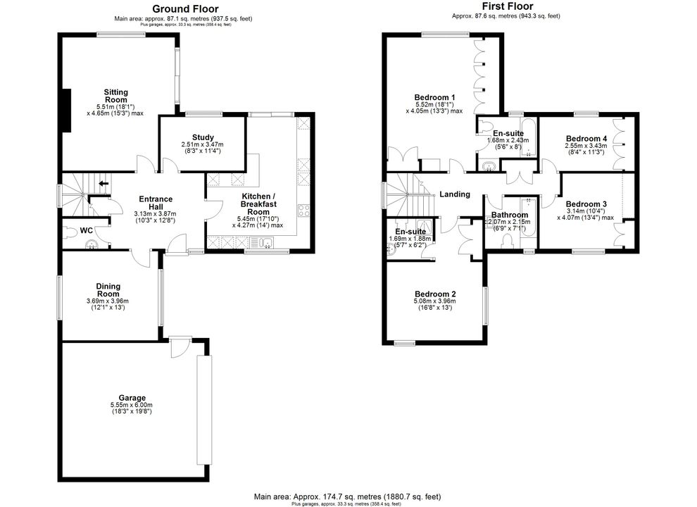 Upstairs, there are four generously sized double bedrooms, each with fitted wardrobes. The principal bedroom and second bedroom both enjoy en suite shower rooms, while the remaining rooms are served by a well-appointed three-piece family bathroom. The principal room also benefits from air conditioning.