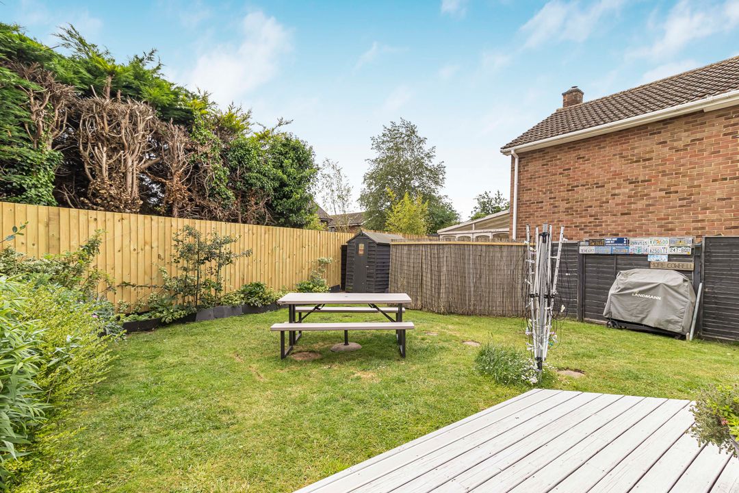 The south-facing rear garden is a key feature of this property, offering a decked seating area directly off the rear reception room. The rest of the garden is mainly laid to lawn, with planted borders containing a variety of shrubs, flowers, and small trees. The garden is enclosed by panel fencing and features a shed in the rear corner, alongside the oil tank.