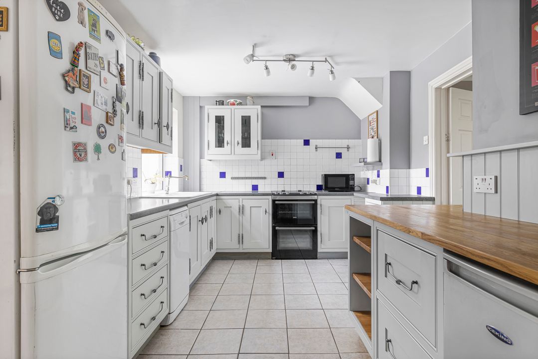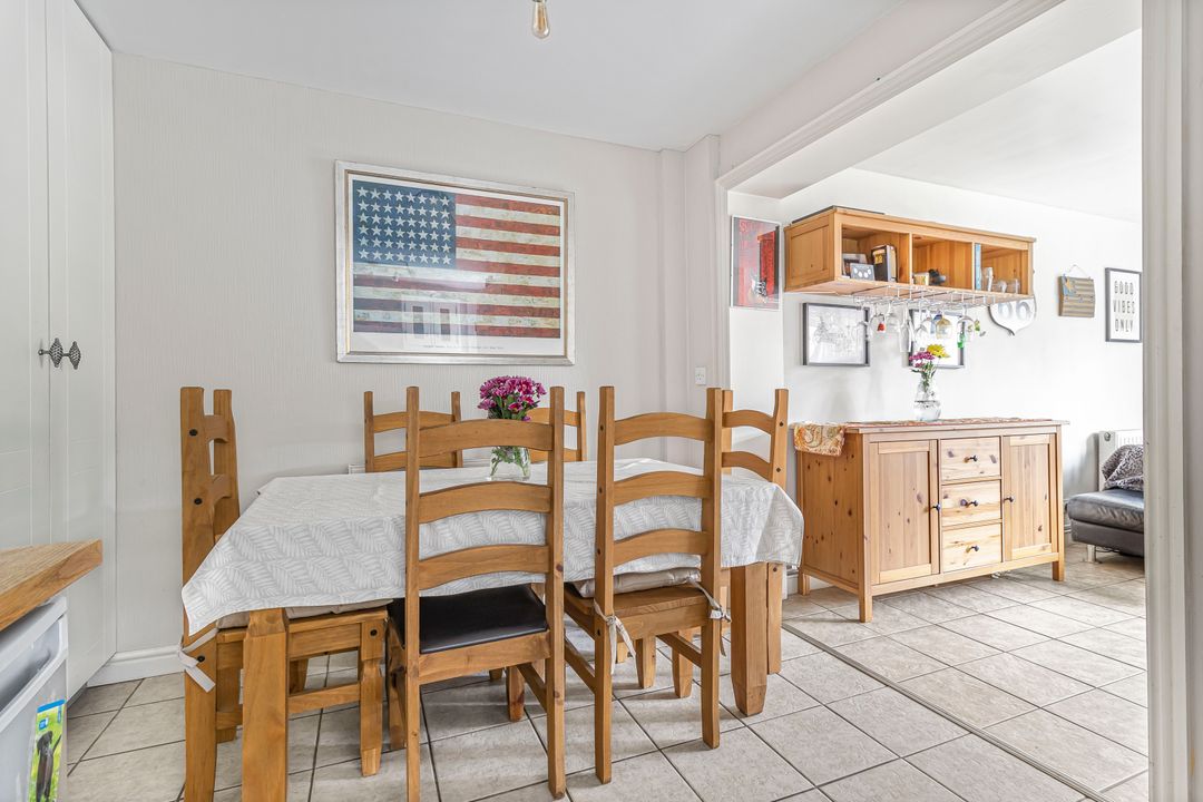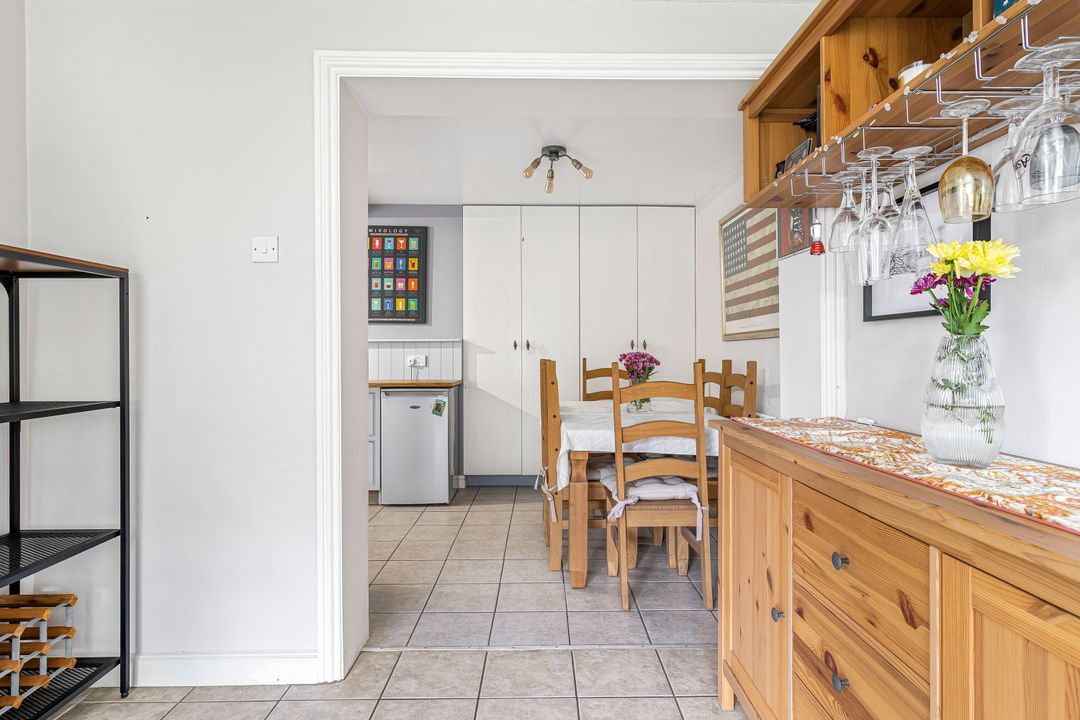 The kitchen/dining room has been opened up to create a sociable and functional space. The kitchen is fitted with solid wood base and wall units, generous work surfaces, and space/plumbing for appliances. The dining area includes a built-in storage cupboard and flows through to an additional rear reception room.