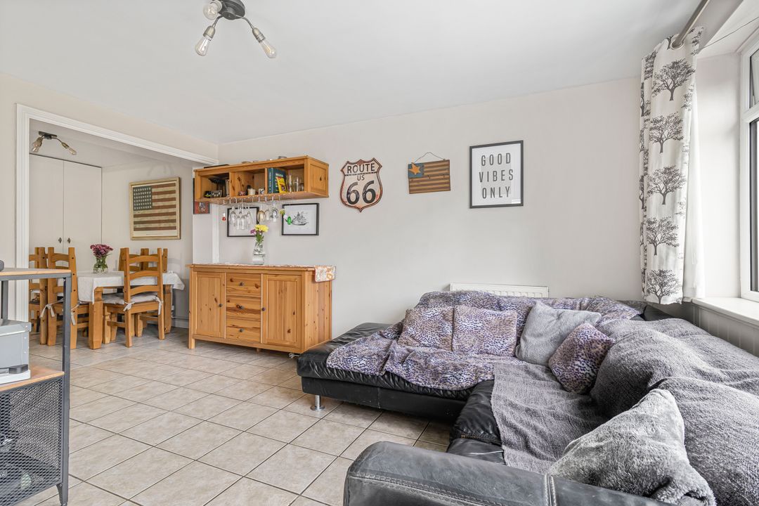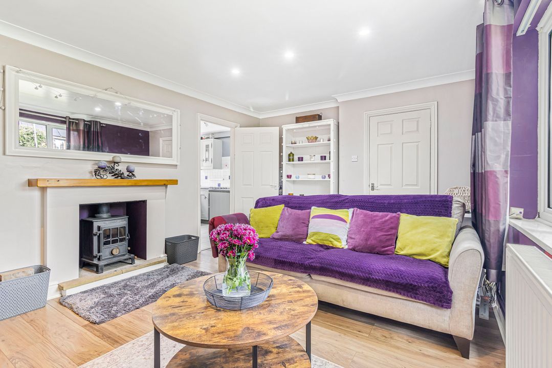 The living room, located at the front of the property, is a cosy space with a modern log burner, understairs storage, and a large front-facing window that fills the room with natural light.