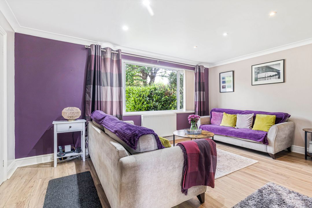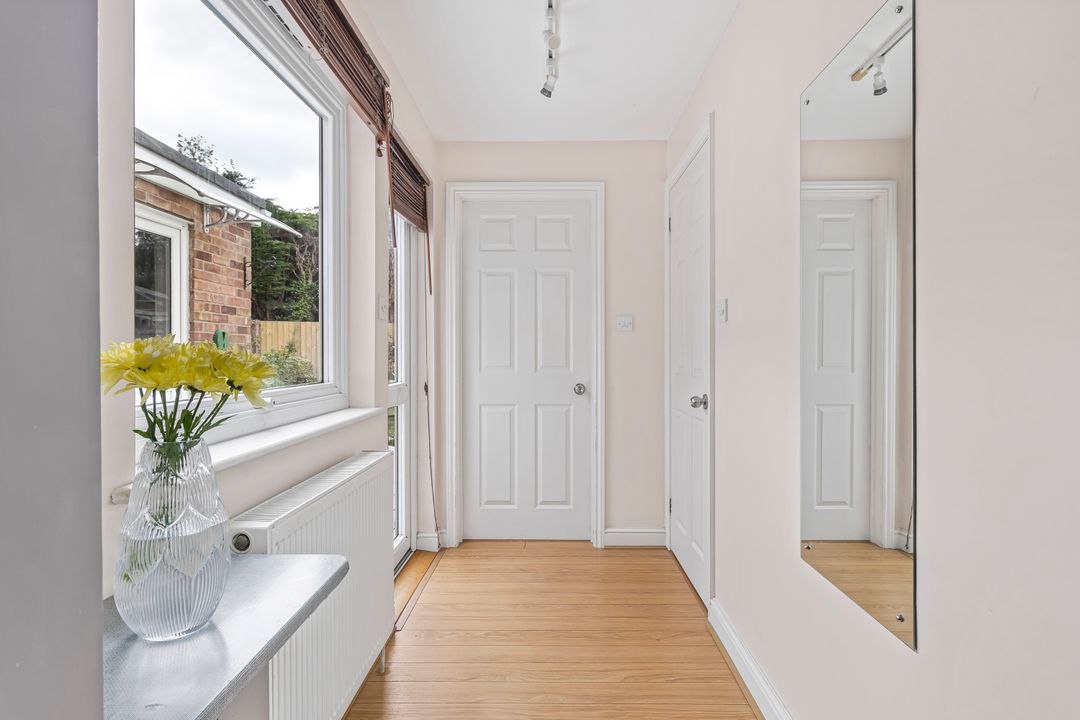 The property is approached via a gravel driveway that also allows access to the rear garden. The front garden is laid to lawn, framed by mature hedges and shrubs which define the boundary to the adjoining home.