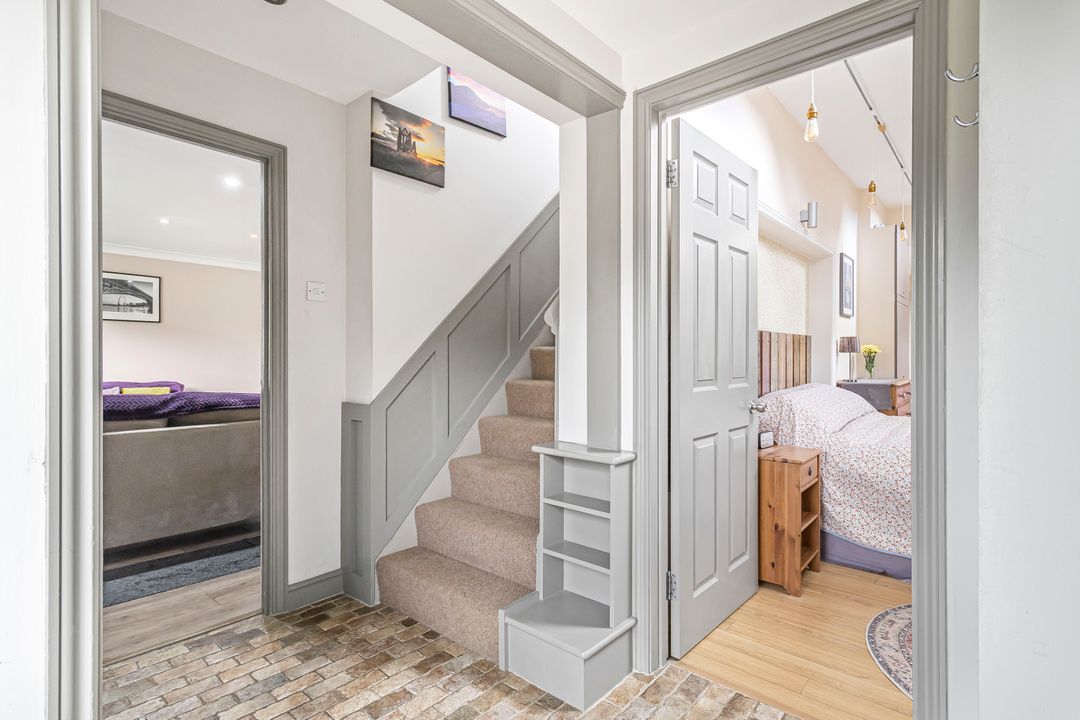 You enter through a practical entrance porch that leads into the main hallway, offering two storage cupboards, stairs to the first floor, and access to the living room and ground floor bedroom.