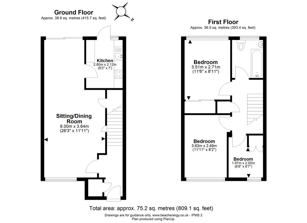 The accommodation extends to approximately 809 sq. ft. and comprises a bright and generously proportioned open-plan sitting/dining room measuring over 26ft in length, with sliding patio doors opening directly onto the garden. The newly installed kitchen features a range of contemporary units, integrated oven and tiled splashbacks, and provides direct access to the rear garden.