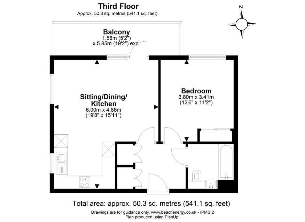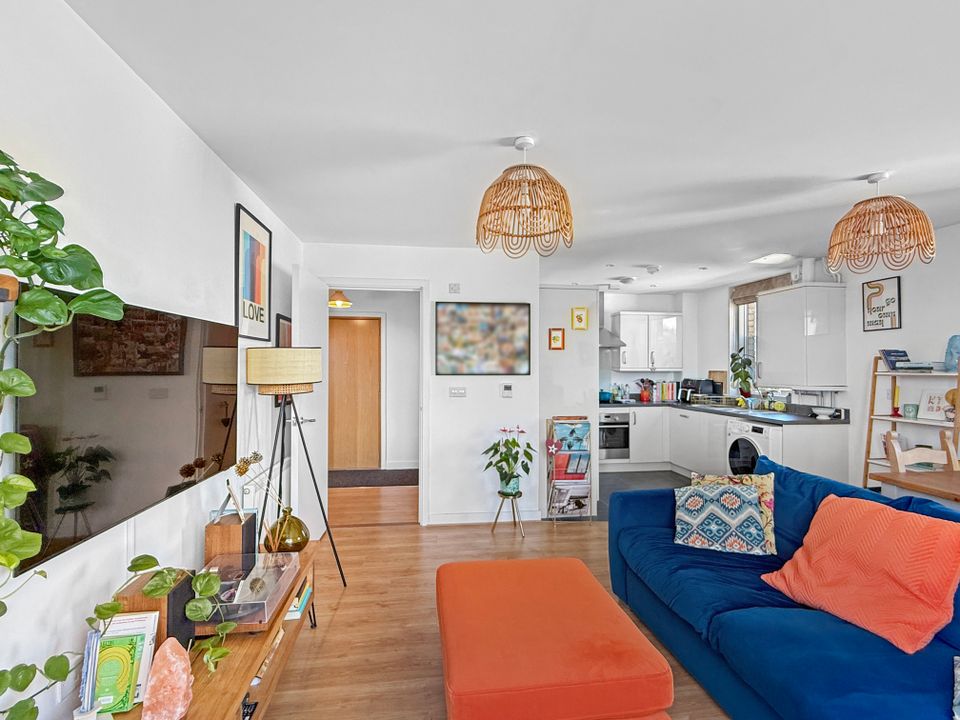 From the moment you enter, you’re greeted by a wide hallway with two large integrated storage cupboards, ideal for keeping life effortlessly organised. To your left, the space opens into a stylish modern kitchen, dining/living space, complete with sleek units, integrated appliances and generous worktop space. This flows seamlessly into the open-plan living and dining area, creating an inviting hub for everyday living and entertaining. Floor-to-ceiling windows and doors flood the room with natural light and frame far-reaching roof-top views, while providing direct access to a spacious balcony.