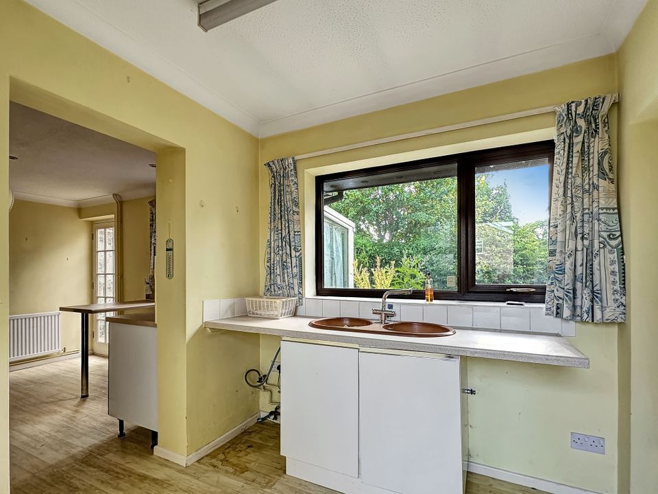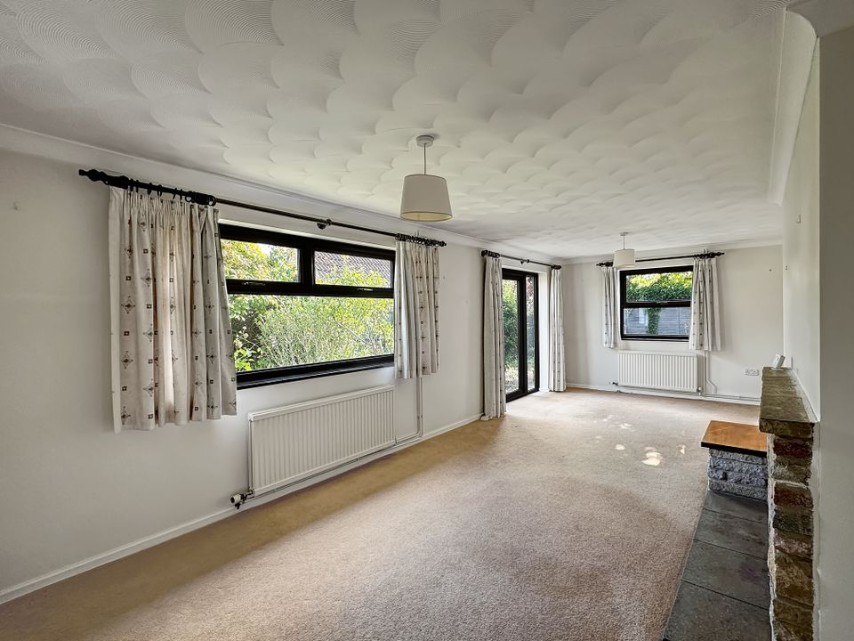 The accommodation is arranged around an entrance hall, providing access to all rooms. The sitting/dining room features a double-glazed door and windows overlooking the garden and a charming feature fireplace, creating a focal point for the space.