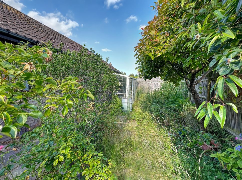 The gardens extend to the side and rear of the property, offering privacy with high-level fencing and a mix of paved and gravelled areas, enhanced by a selection of mature plants and hedgerows.