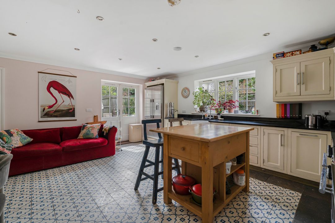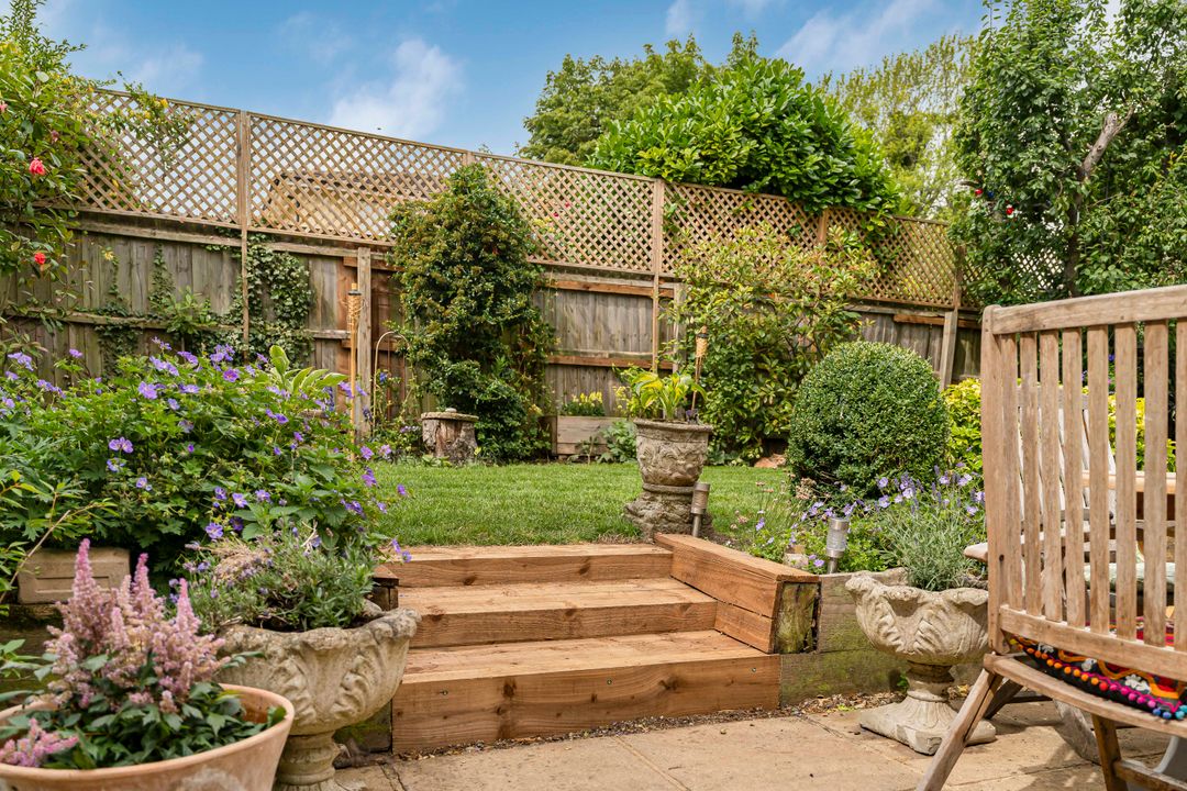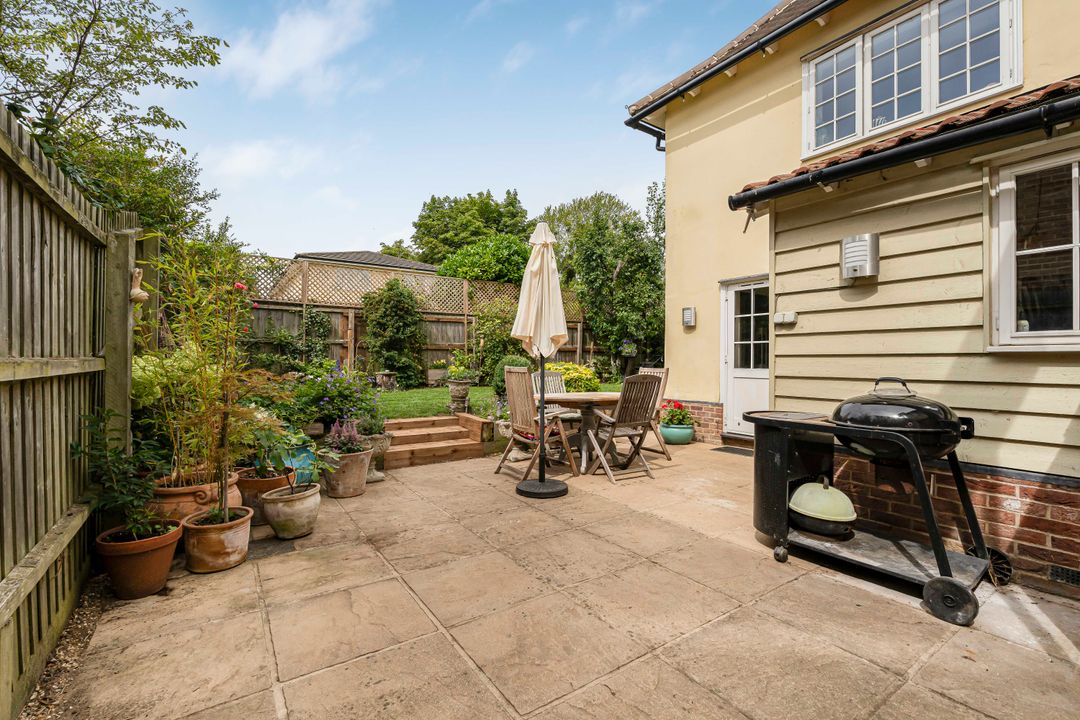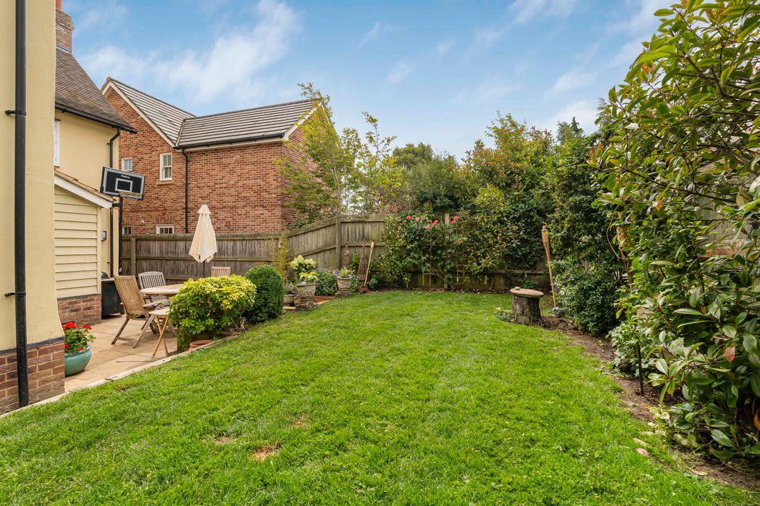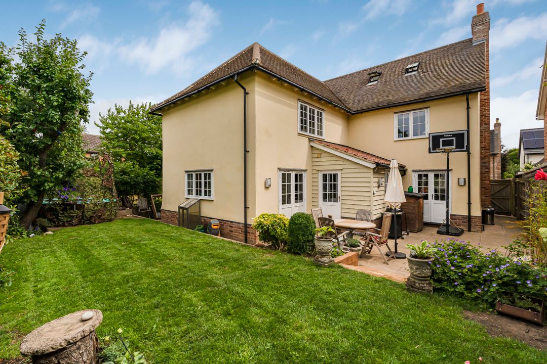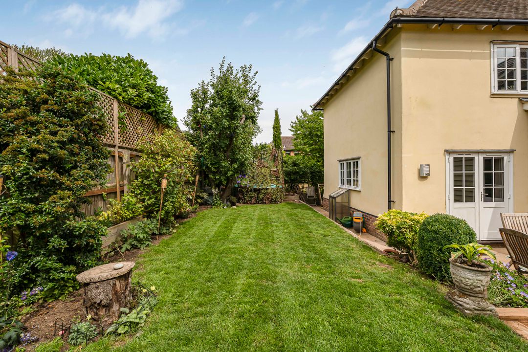 Outside, the rear garden offers a mature outdoor space. A patio area leads directly off the back of the house and wraps around to provide side access. The main garden is laid to lawn and framed by a lovely mix of mature trees, hedging, and established shrubs.