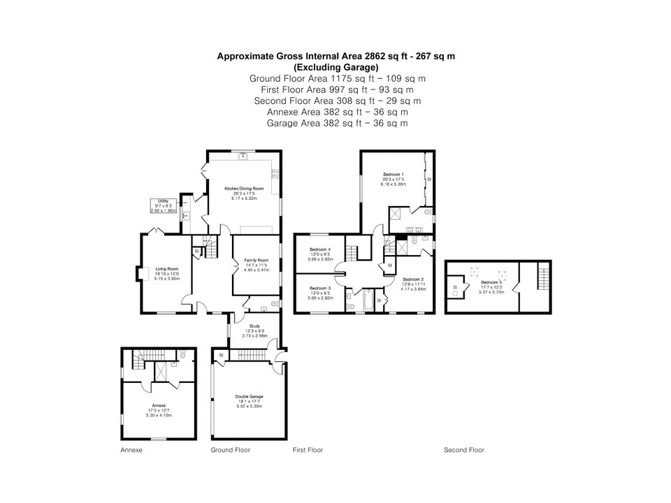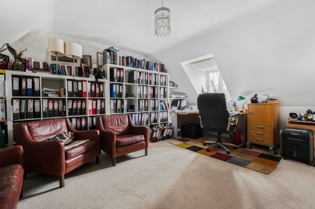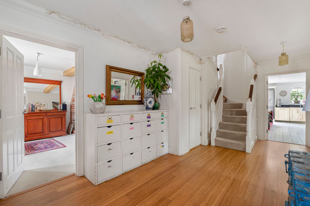 Upstairs, the first floor houses four well-proportioned bedrooms. The principal suite is particularly generous, offering extensive fitted storage and an en-suite shower room. The second bedroom also has an en-suite while the two further bedrooms on this floor share a family bathroom. A second staircase leads to the top floor where you'll find a fifth double bedroom, ideal as a guest suite.