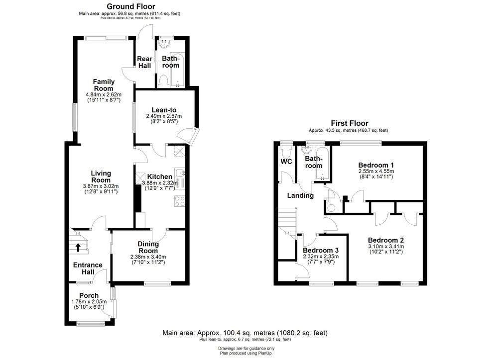 The ground floor is entered via a practical porch that leads into an entrance hall, providing access to the main living spaces. At the front of the house is a bright dining room, which connects through to a well-appointed kitchen fitted with cabinetry and appliances. Beyond the kitchen is a lean-to and a rear hallway, which leads to a ground floor bathroom complete with WC, basin, and bath with gravity-fed shower. Towards the rear of the home, the layout opens into a spacious living room, which flows into a large family room with views and access out to the garden, offering a perfect space for relaxing or entertaining.