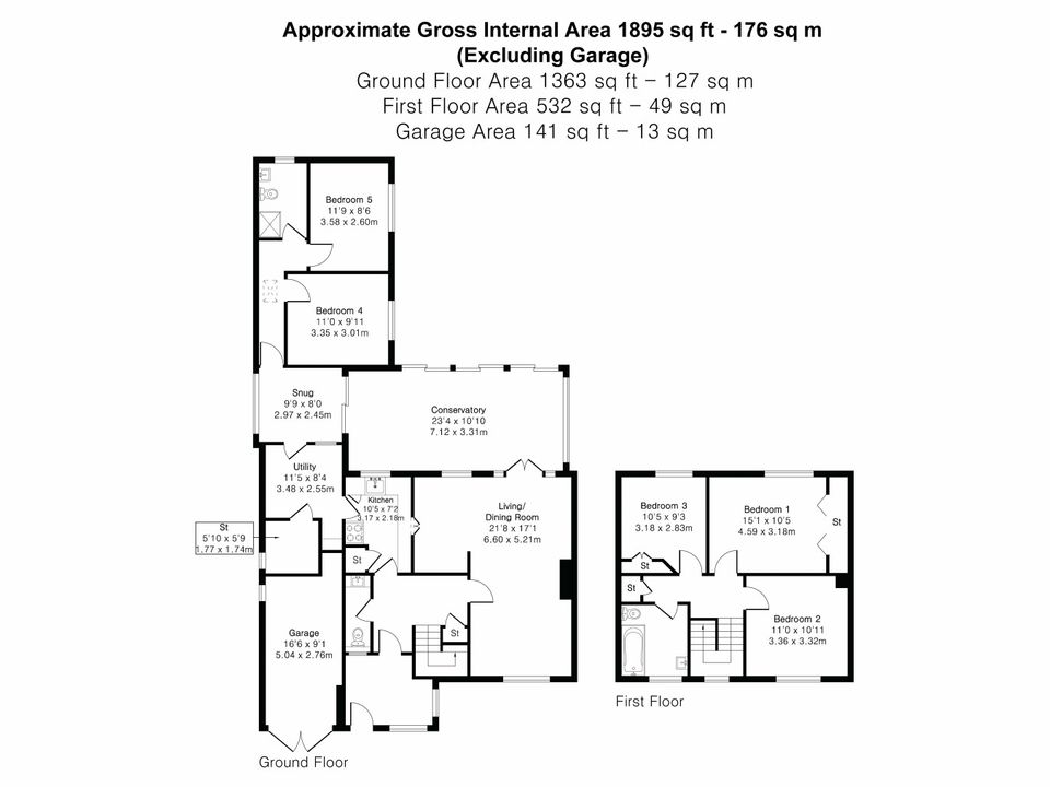 The ground floor opens into a bright and spacious hallway leading through to a generous living/dining room, with access to the rear conservatory overlooking the garden. A fitted kitchen links to a practical utility room, which in turn leads to a snug, creating a useful additional reception space. To the rear of the house are two ground floor bedrooms and a bathroom, giving excellent flexibility for guest, study, or annexe use. A cloakroom and integral garage complete the ground floor.