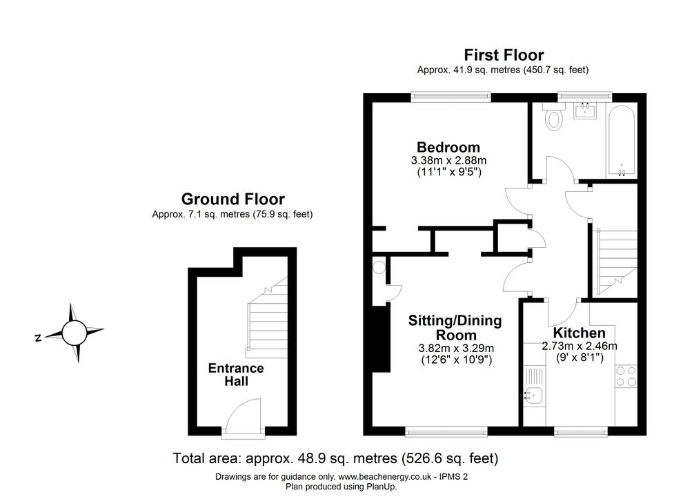 The entrance opens into a ground floor hallway, ideal for storing coats, shoes, or even a bike, with stairs leading up to the main accommodation. On the first floor, the sitting/dining room is filled with natural light from a large front-facing window and features a useful storage cupboard neatly positioned beside the chimney breast — perfect for keeping the space uncluttered.