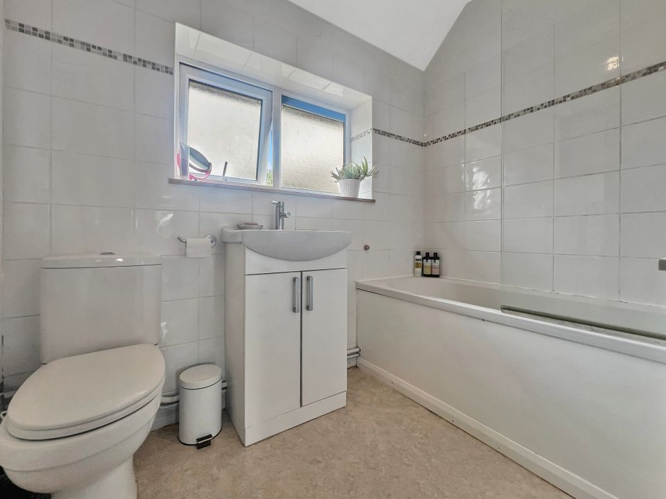 The bedroom is a generous double, enjoying peaceful views over the rear garden, while the bathroom is fitted with a modern three-piece white suite. It includes a shower over the bath with a glass shower screen and is finished with floor-to-ceiling tiling for a sleek, contemporary feel.