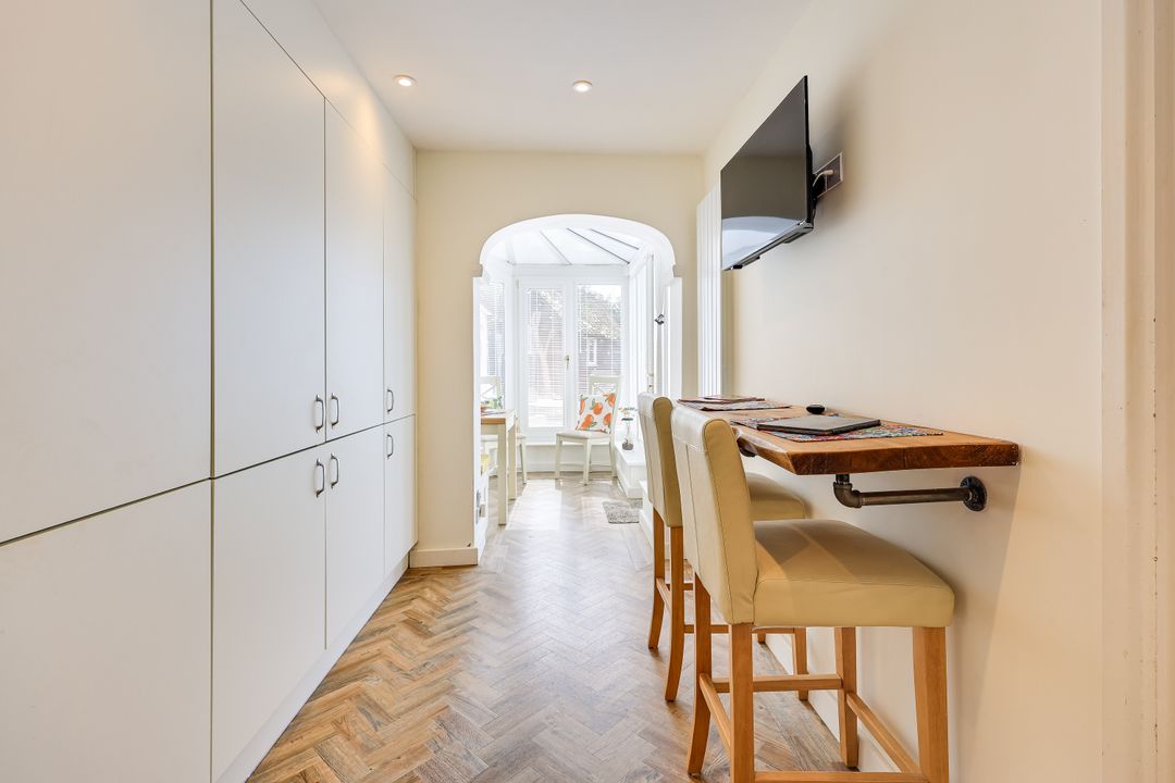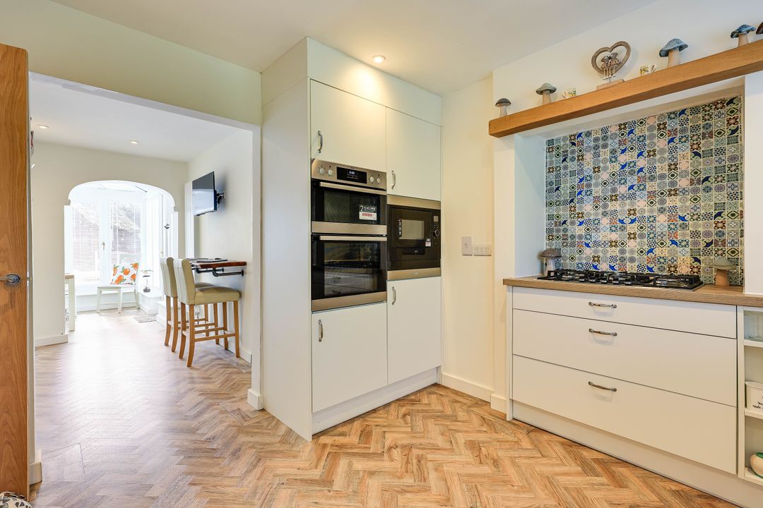 The kitchen is both stylish and functional, fitted with contemporary white cabinetry, wooden worktops, and integrated appliances including a double oven and gas hob. The space benefits from natural light through large windows with plantation shutters. Flowing from here, the breakfast room provides a charming spot for casual dining, while the adjoining conservatory makes for a light-filled retreat with views across the garden.