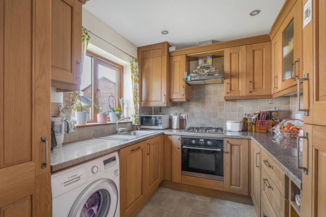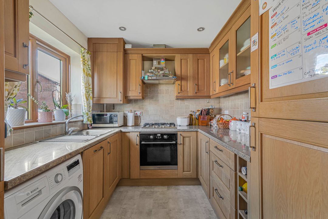 To the front of the house, the kitchen is smartly designed with a full range of fitted units and clever storage solutions, including deep pan drawers, a pull-out larder and corner cupboards. Integrated appliances include a fridge/freezer, dishwasher, washing machine, oven, hob and extractor, making this a highly practical and well-equipped space.