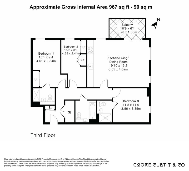 The apartment is positioned on the third floor and benefits from lift access. The well-planned layout includes an open-plan kitchen, living and dining area with integrated appliances and French doors leading to a private balcony. There are three generous bedrooms, including two principal bedrooms each with an en-suite shower room, alongside a stylish family bathroom and excellent storage throughout.