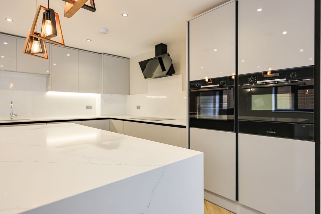 Quartz worktops with matching quartz splashback