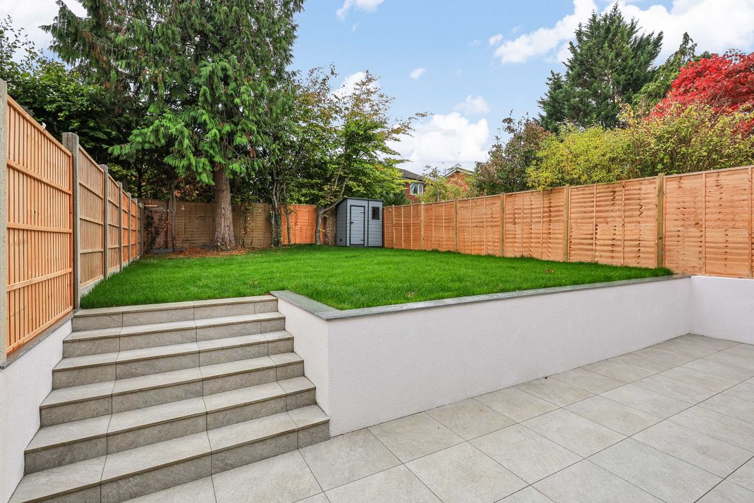 Landscaped garden with porcelain patio and matching steps