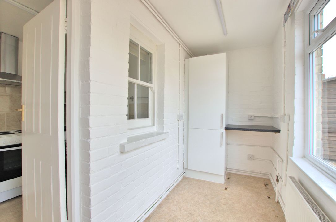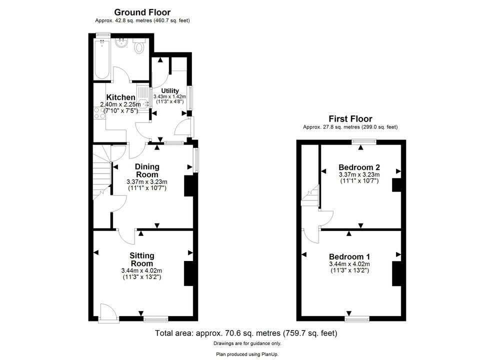 The property offers around 72 sqm / 775 sqft of accommodation, including two reception rooms, a modern kitchen, a utility room and a bathroom. Upstairs are two double bedrooms, both well-proportioned and neatly presented.