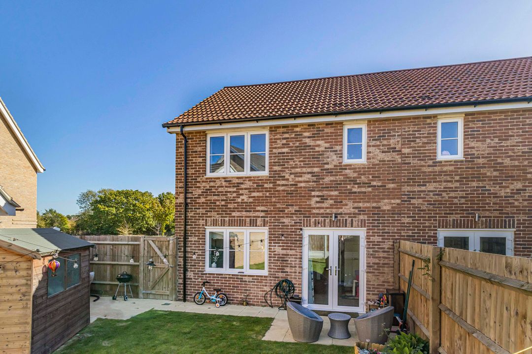 Outside, the rear garden is mainly laid to lawn with a patio seating area — perfect for relaxing or entertaining — along with side access and a garden shed. The property also benefits from private driveway parking.