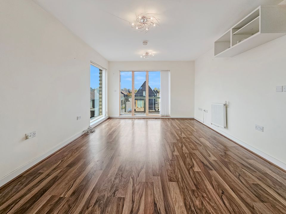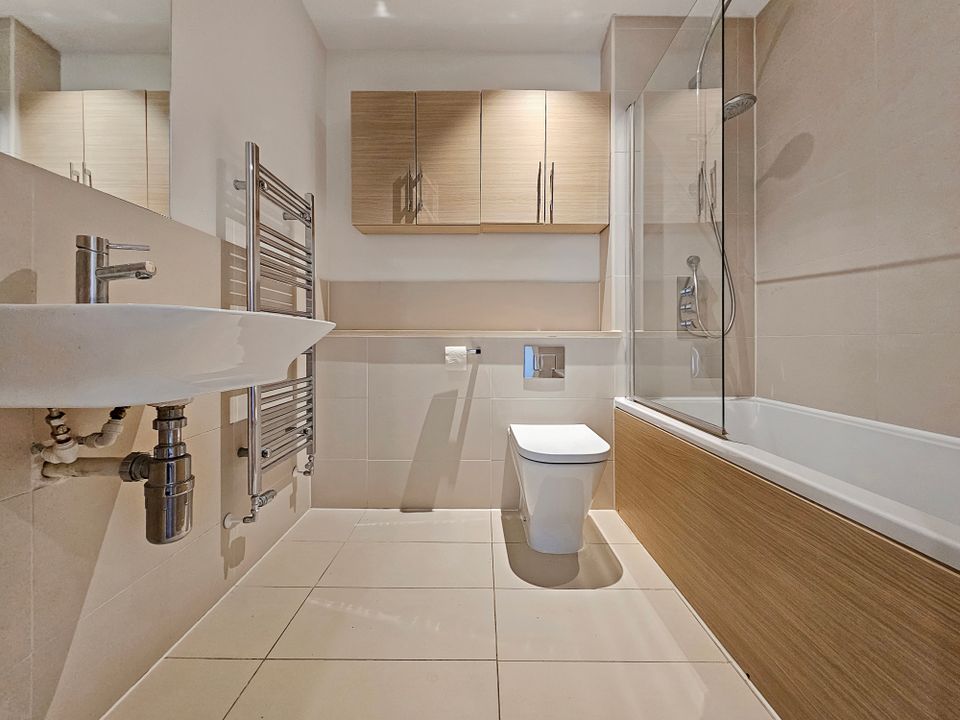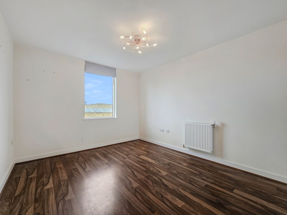 The principal bedroom benefits from built-in wardrobes, floor-to-ceiling windows. A second double bedroom also makes a perfect office space too. Both bedrooms are served by a contemporary family bathroom with modern white fittings.