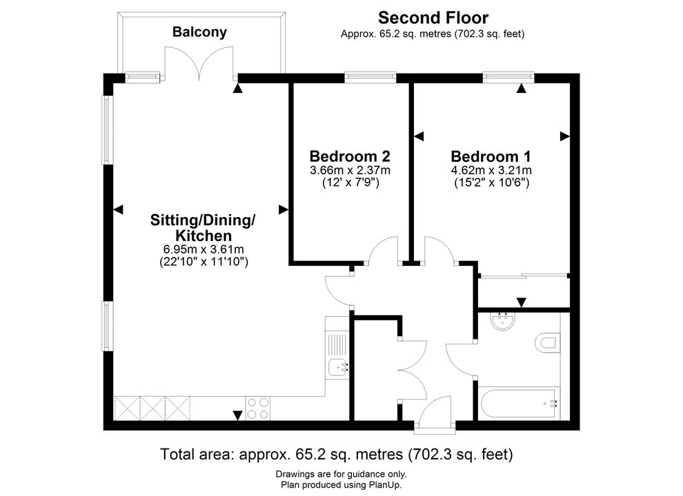 This well-designed apartment offers a practical layout with a spacious open-plan living area and two bedrooms, positioned on the second floor of the building.