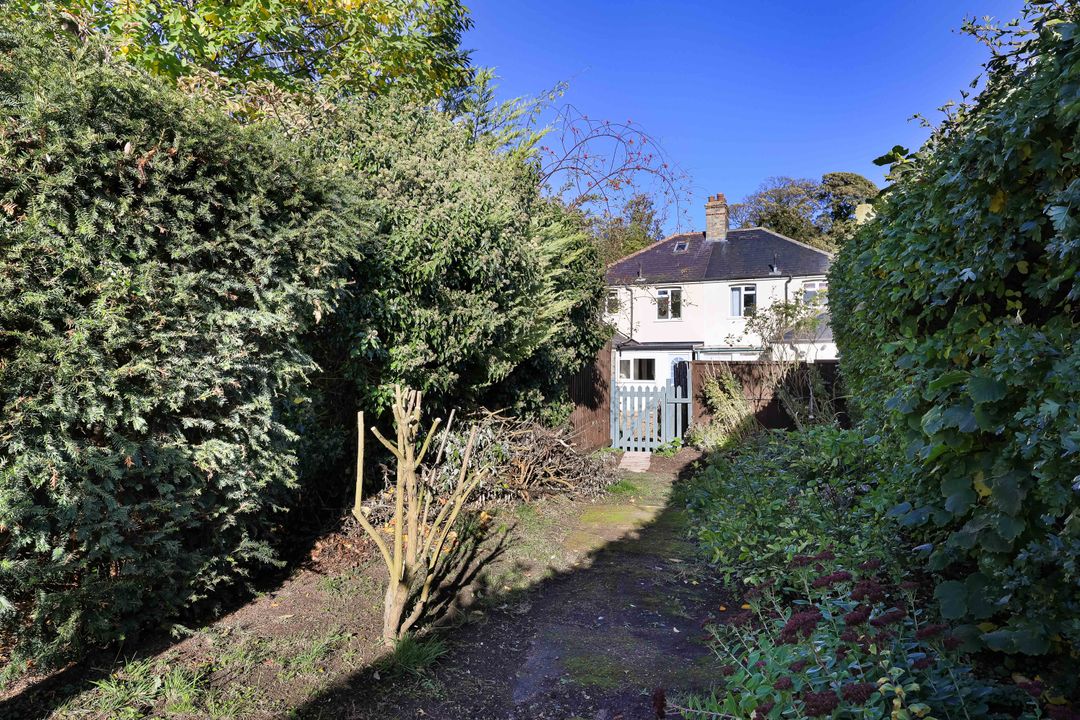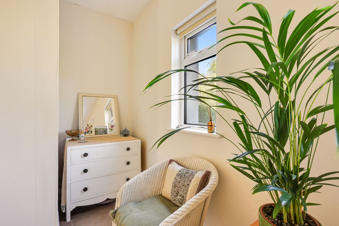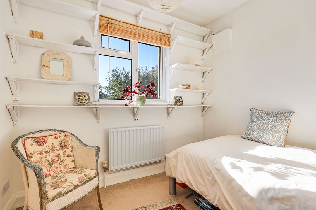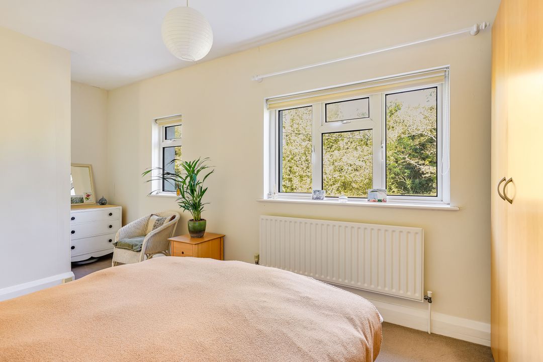 Upstairs, the landing leads to three very nicely proportioned bedrooms. The main bedroom, located at the front, features two windows with views over mature trees. The second and third bedrooms offer views over the garden.